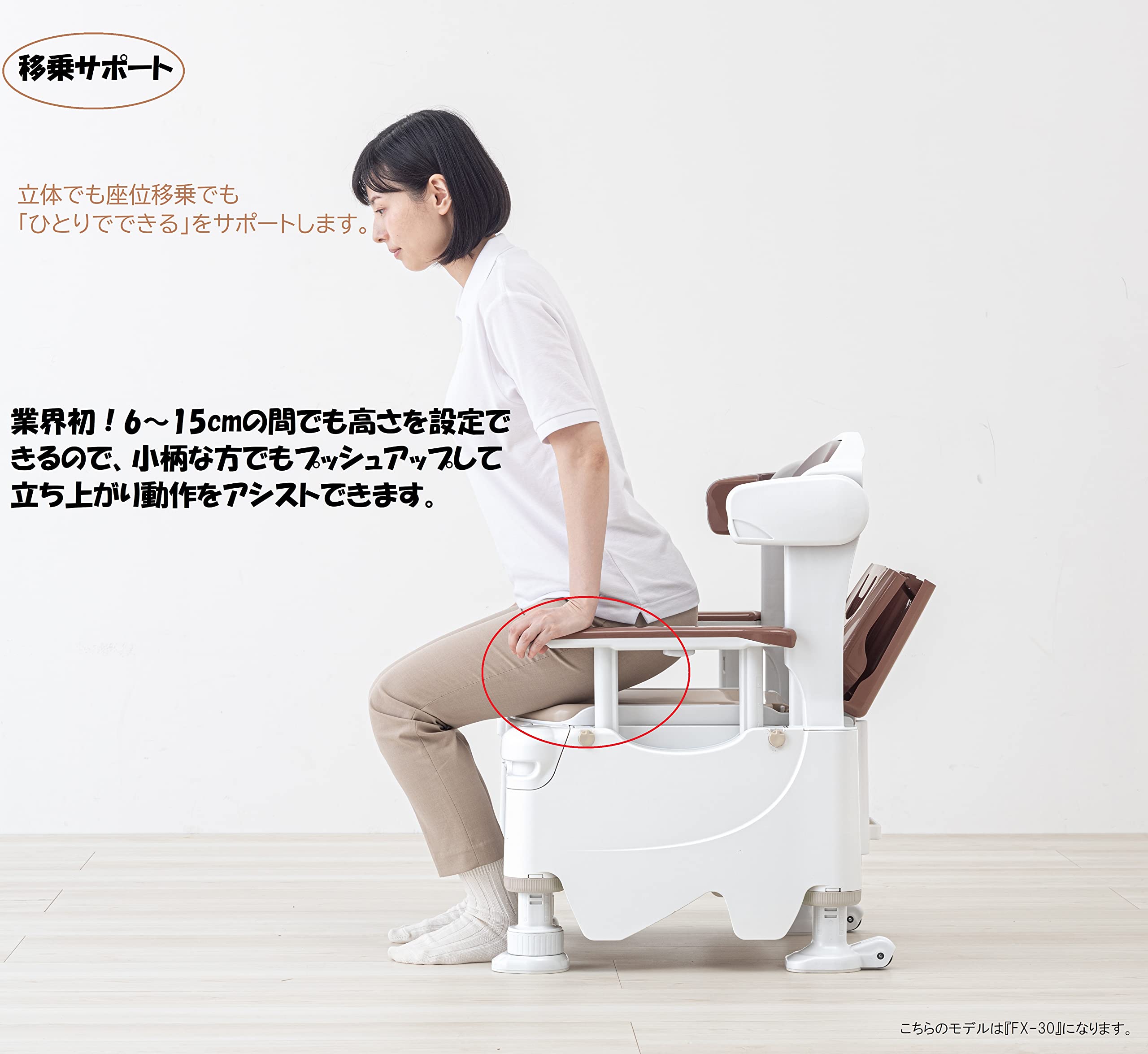 移乗動作にあわせてひじ掛け2段階に調整可能:ノーマルポジションで高さ0、6~24cmに設置。0cmは座位移乗動作をサポート。ハイポジションで高さ0、6~30cmに設定。最大30cmは立位移乗での安定した立ち座りに最適。
