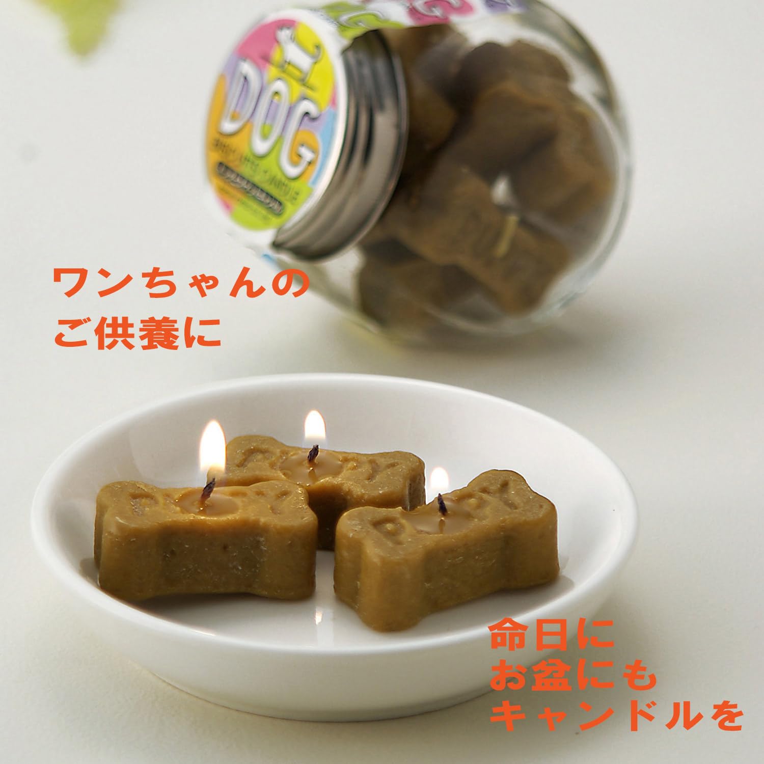 骨型のビスケットをかたどったキャンドルで、ビンの容器に入っています。愛犬のご供養に。燃焼時間:約15分