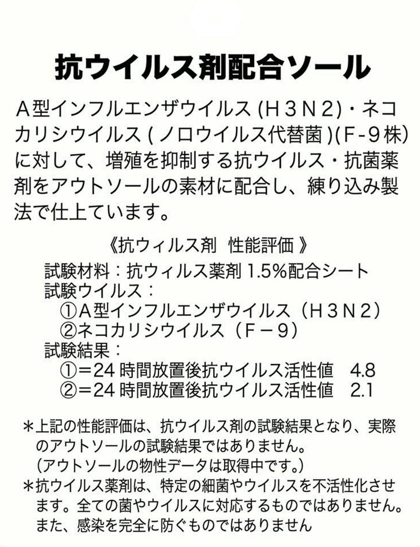アウトソールに抗ウイルス剤を配合した、室内向け抗ウイルスシューズ。