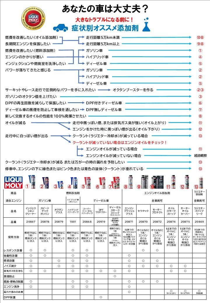 ラジエターの漏れを止めるだけでなく、防止にもなる 冷却システム内の細かい亀裂や漏れを修復します。すべての冷却水、添加剤および凍結防止剤と混合することができます。 また、全てのラジエターで使用でき、特にアルミ製やプラスチック製ラジエターでも使用可能です。予防対策としてのご使用もお勧めします。 使用方法 エンジンが停止した状態で、よく振ってからラジエターに本製品を注入し、約10分程度エンジンをかけたままの状態にしてください。最大10リットルまでの冷却水に対し本製品1本(250ml)を注入してください。