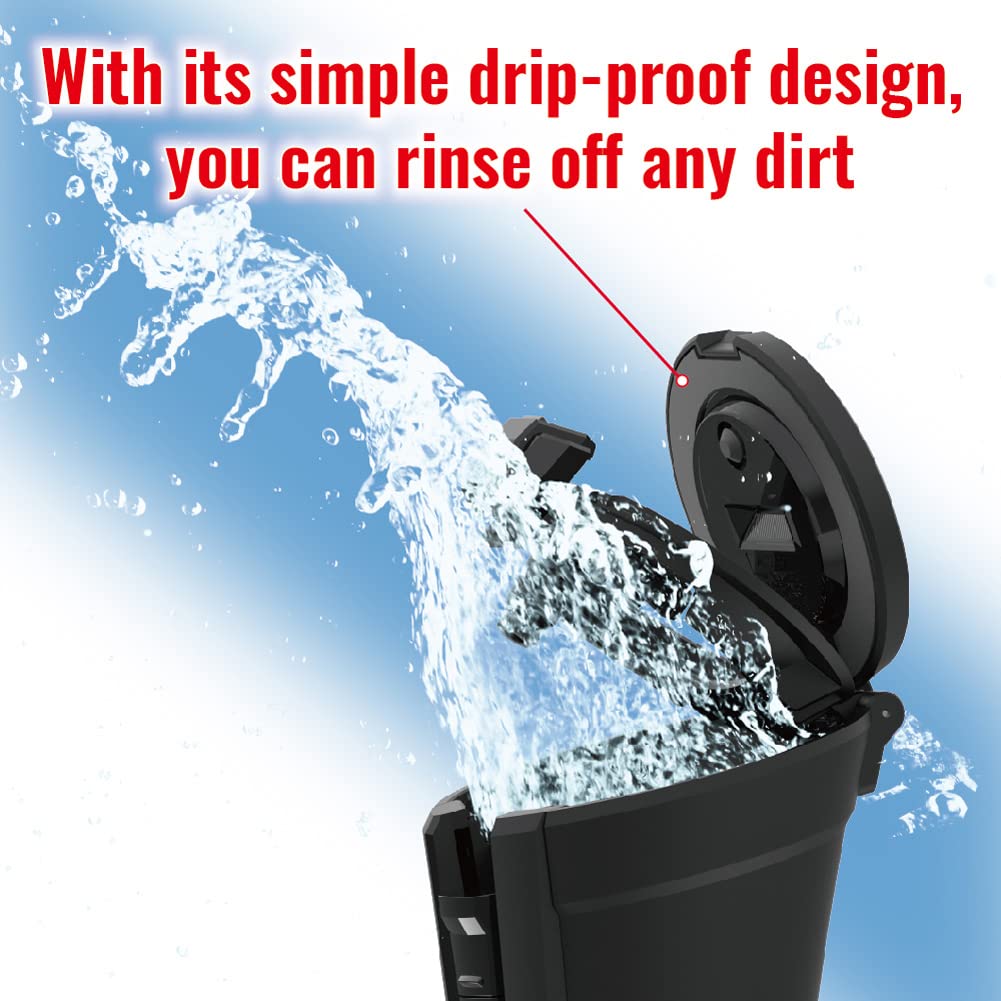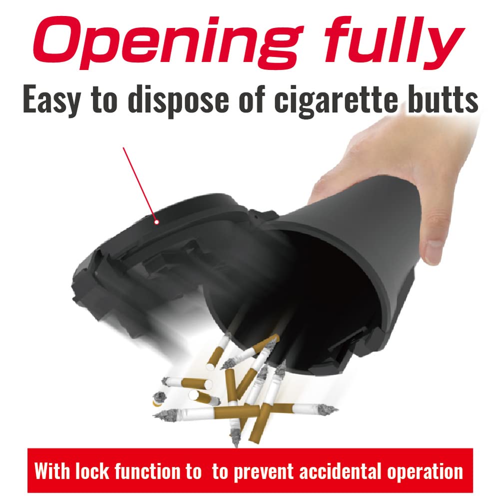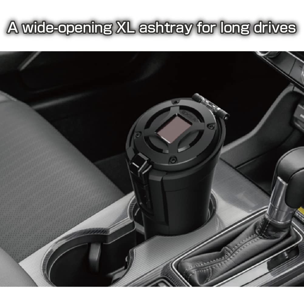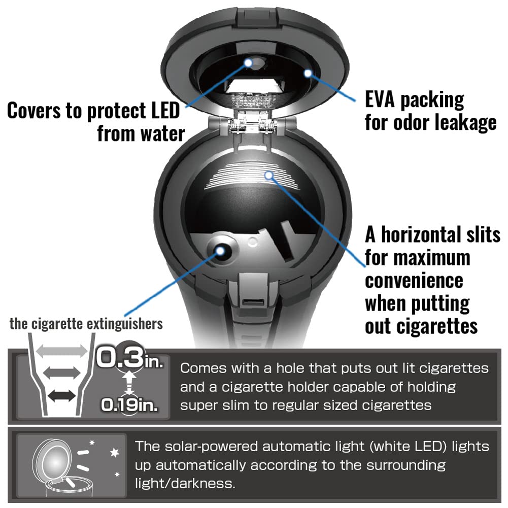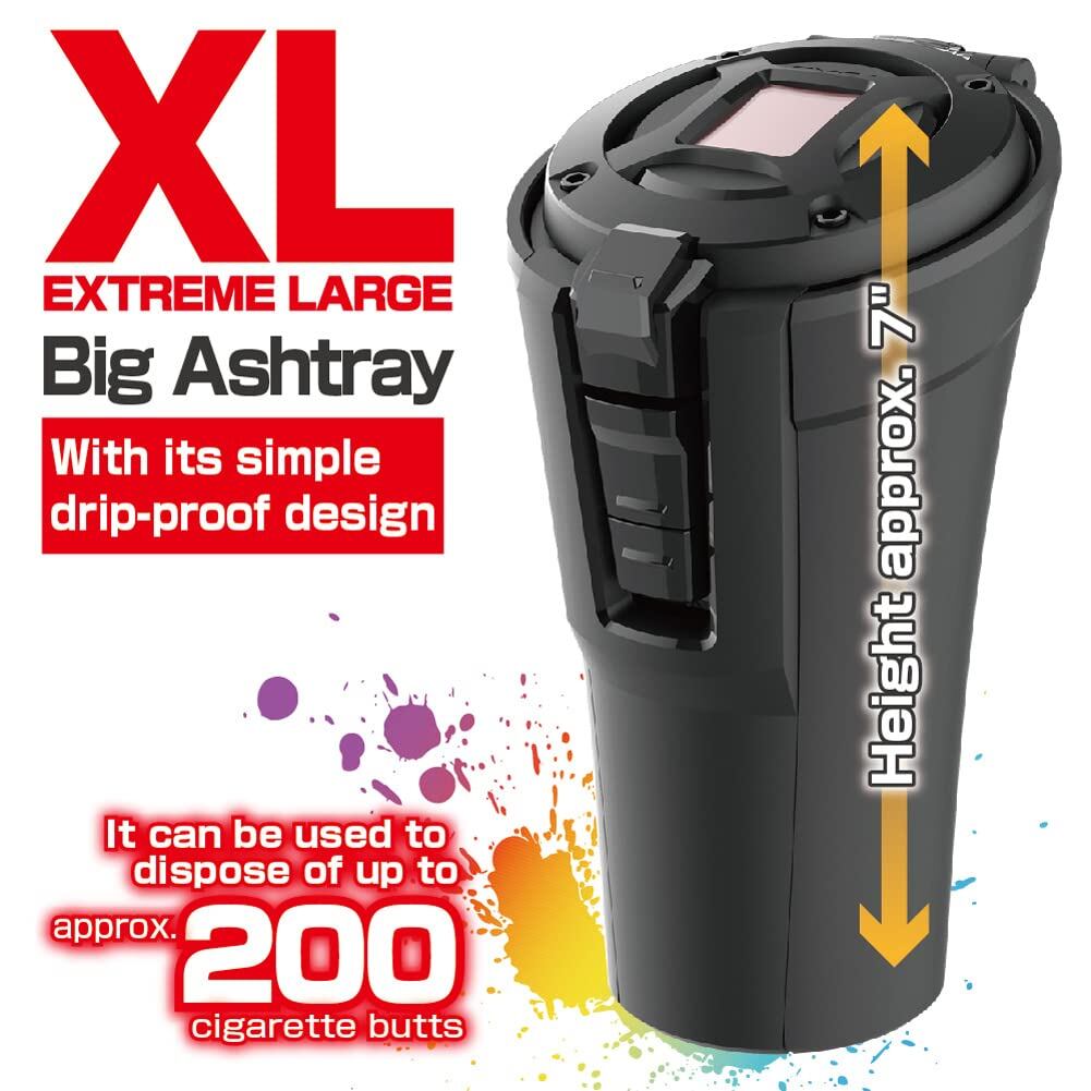 ワイド開口ビッグボディ約200本の吸殻を捨てられるXLサイズ灰皿。全開灰すて機能、簡易防滴仕様、臭い漏れ&衝撃音軽減設計。スーパースリムの太さまで(5~8mm) 対応の消火穴とタバコ置き