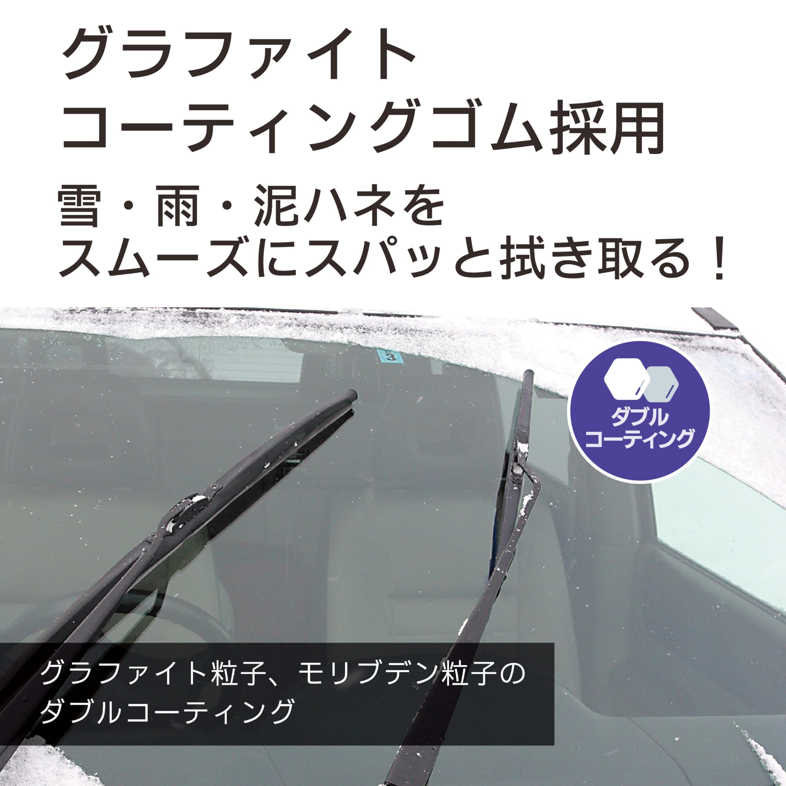 スーパーグラファイトスノーワイパーは、最高品質天然ゴムにグラファイト粒子、モリブデン粒子のダブルコーティングゴムを採用。2つの粒子のコーティングによりの摩擦抵抗が大幅に軽減し、不快な音、ビビリのない滑らかな動きを実現し、雪、雨、泥ハネをスパっと拭き取ります。