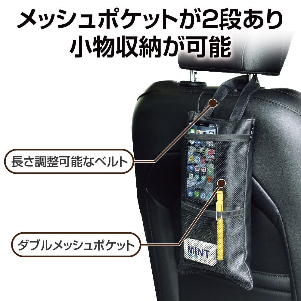 ヘッドレストに取付ける縦向きタイプのティッシュケース。裏面にメッシュポケットが2段あり小物が収納できて便利。高級感がある本革調素材を採用。