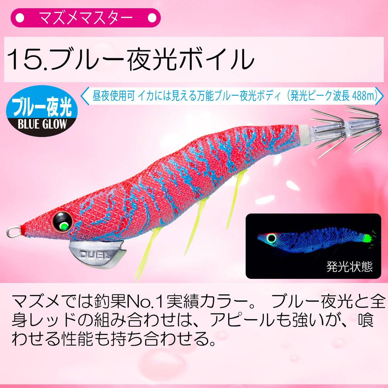 カラー特徴:マズメでは釣果No.1実績カラー。ブルー夜光と全身レッドの組み合わせは、アピールも強いが喰わせる性能も持ち合わせる。