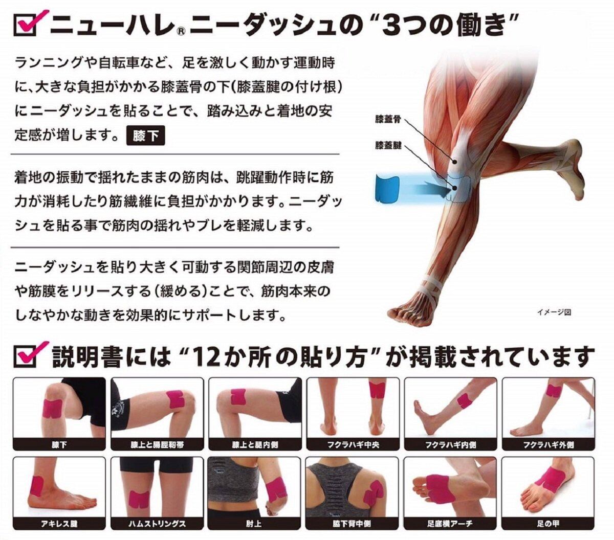 ニーダッシュはこれまでの[すぐ貼れる]シリーズと同様、貼るだけでランニングや自転車、その他のスポーツなど、動作の安定感を増し、貼り付けた筋肉の揺れを防ぐテーピングです。