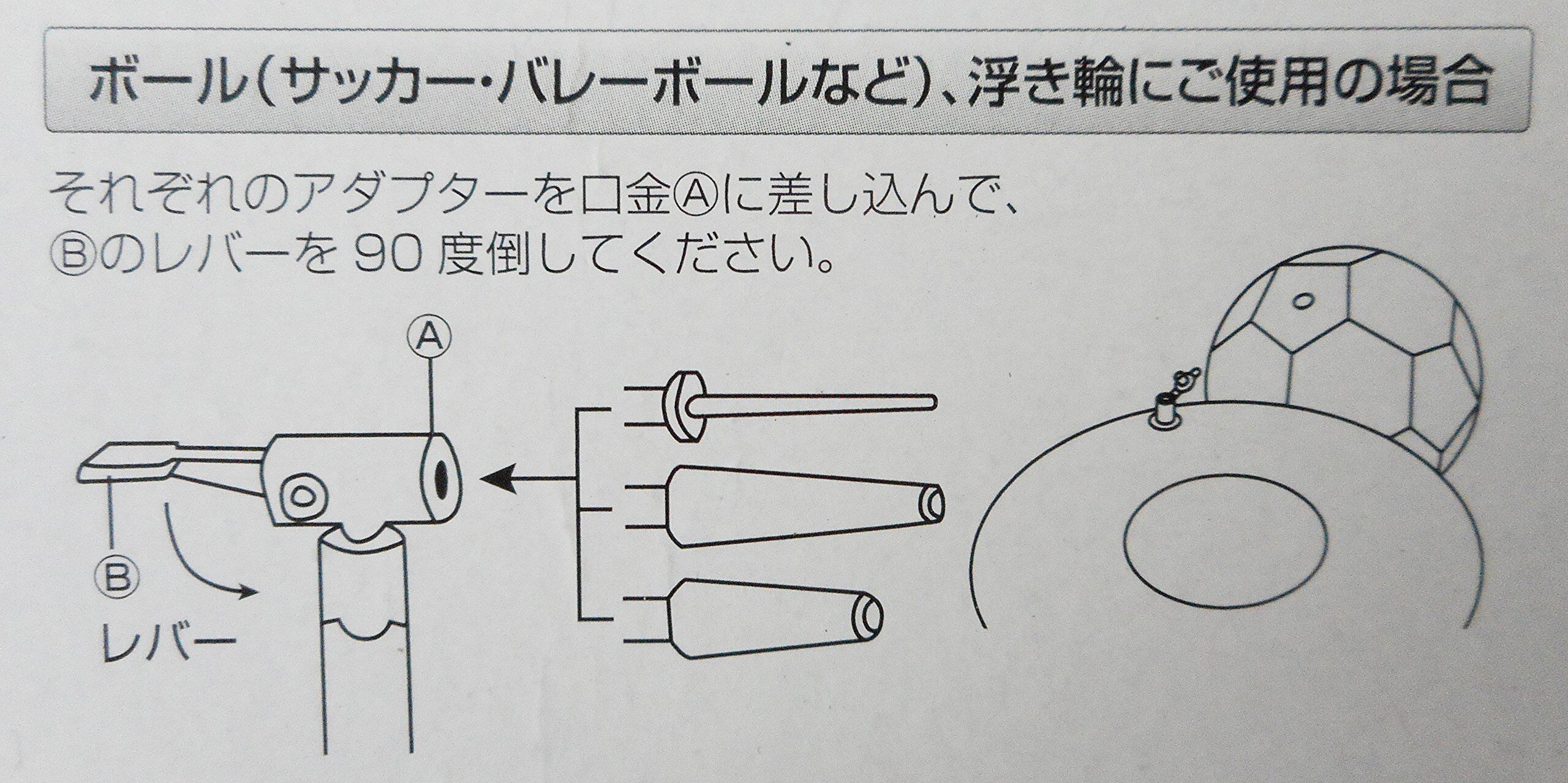 対応バルブ:英式バルブ、米式バルブ、浮き輪・ビニールボート用アダプター、ボール用アダプター