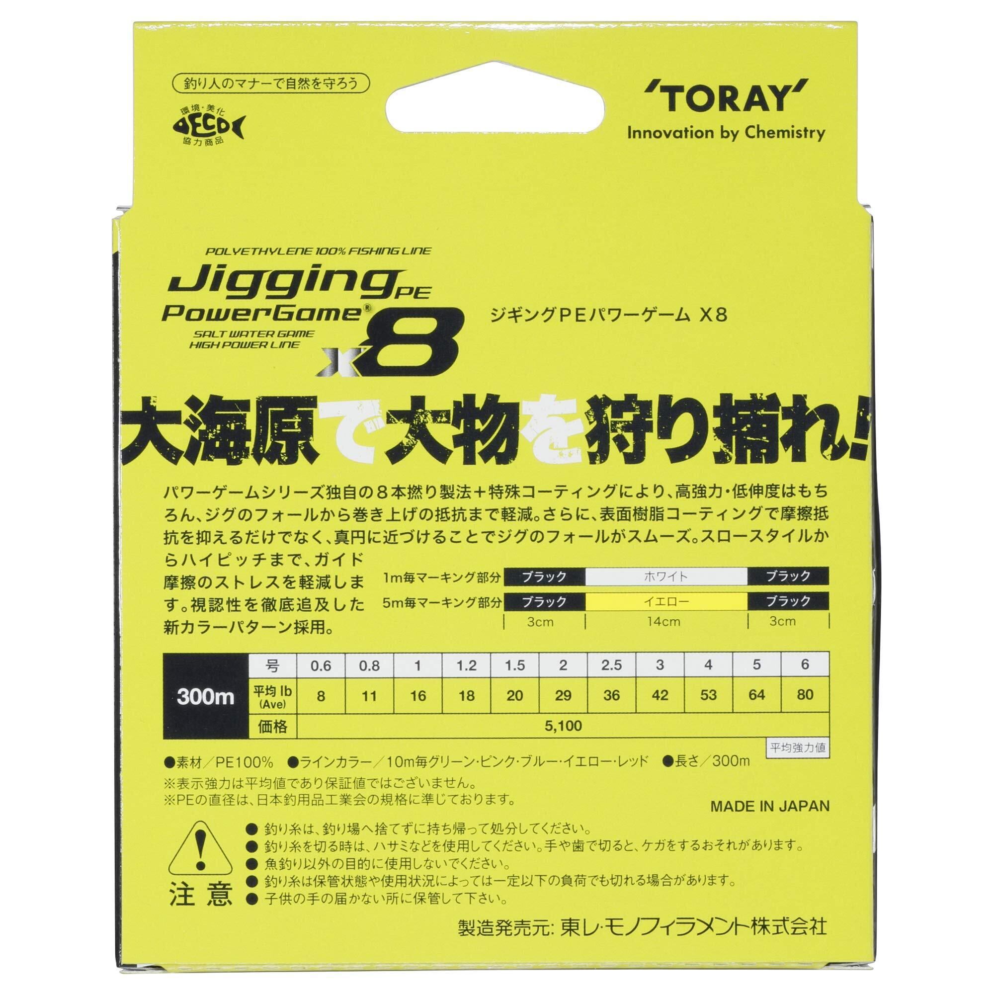 TORAY/東レジギングPE パワーゲーム x8■長さ:300m巻■カラー:グリーン・ピンク・ブルー・イエロー・レッド(10m毎に5色)パワーゲームシリーズ独自の8本撚り製法+特殊コーティングにより、高強力・低伸度はもちろん、ジグのフォールから巻き上げの抵抗まで軽減。さらに、表面樹脂コーティングで摩擦抵抗を抑えるだけでなく、真円に近づけることでジグのフォールがスムーズ。スロースタイルからハイピッチまで、ガイド摩擦のストレスを軽減します。視認性を徹底追及した新カラーパターン採用。