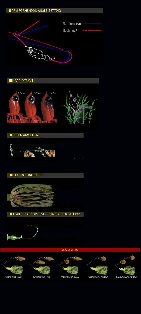野池や河川などの障害物の多いフィールドでの使用を考慮し、スリ抜け性能を追及したタテ扁平コンパクトヘッドに、2連スリットを設けることで、ヘッドシルエットの小さなスピナーベイトには困難だった水掴みの良さを徹底追求。