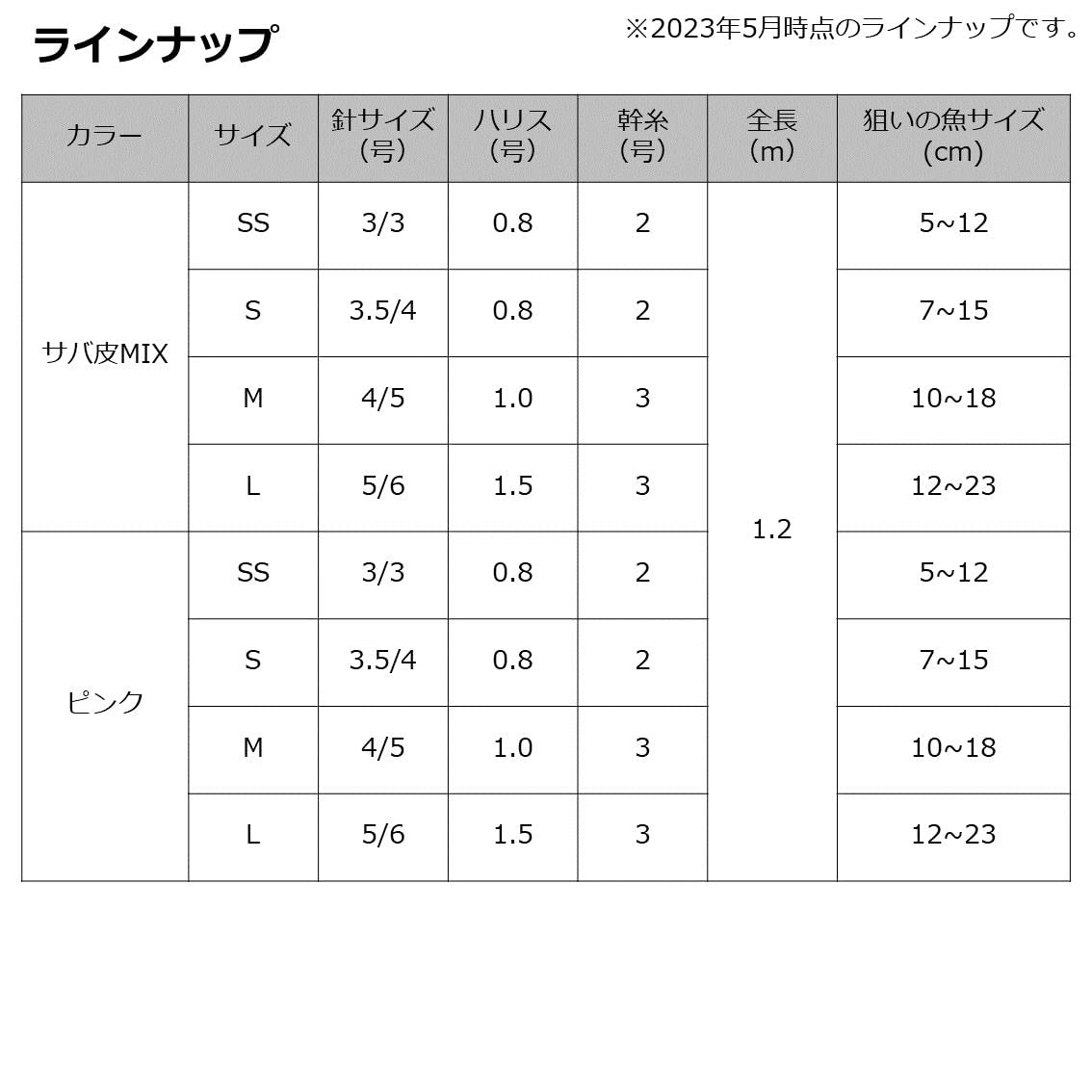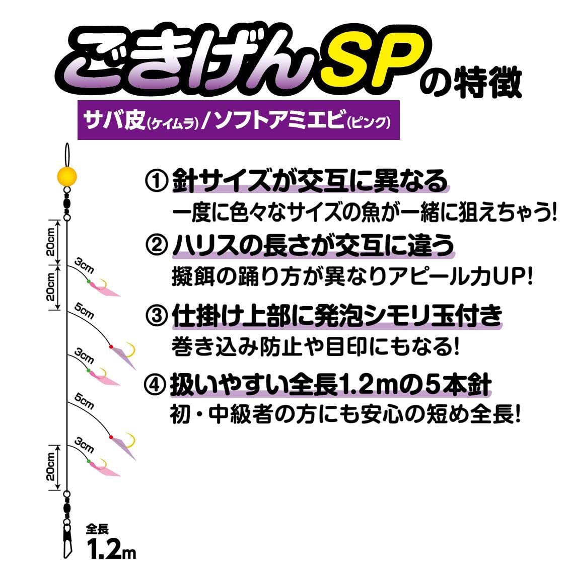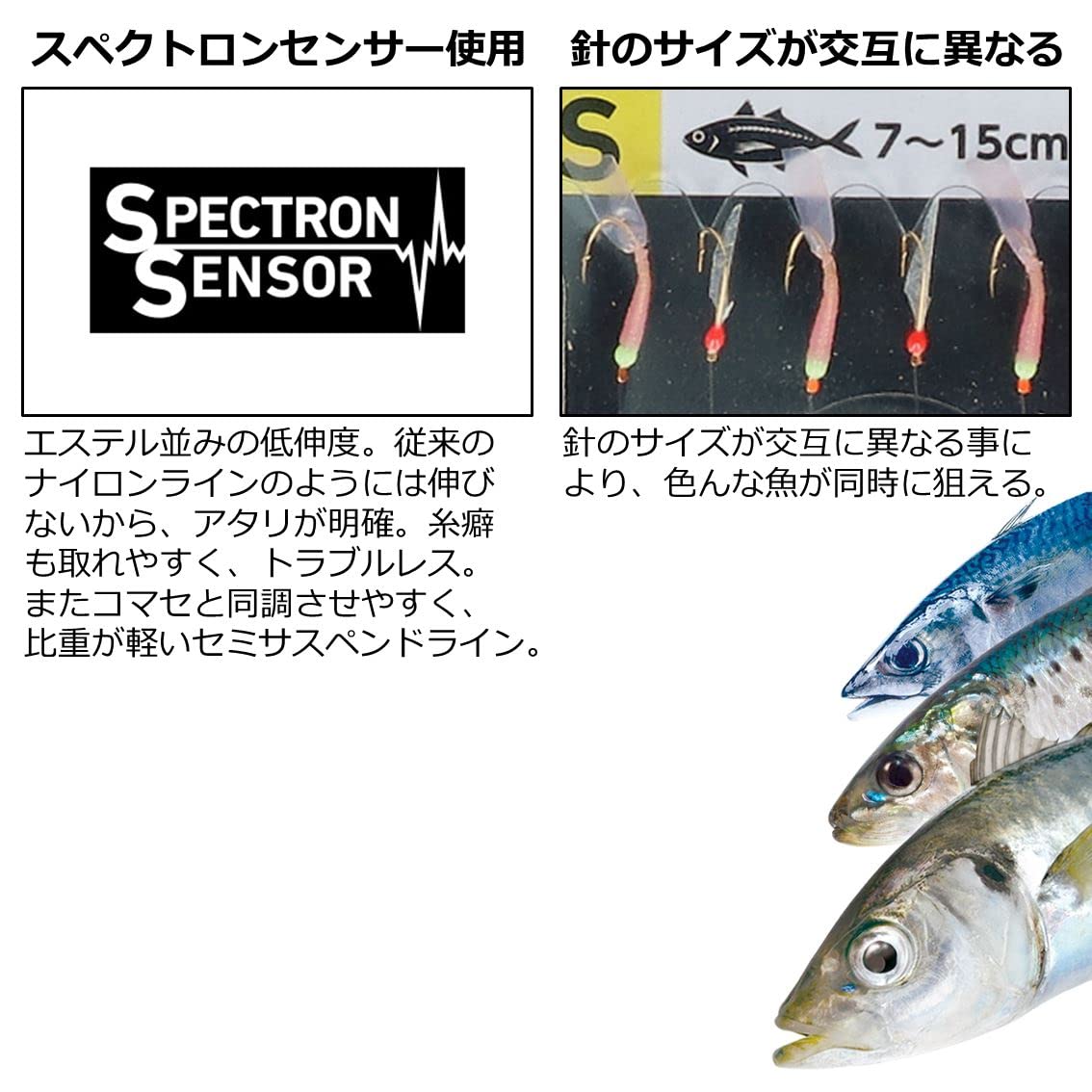 針のサイズが交互に異なる⇒大きさの違う色々な魚が同時に狙えます。(アジ・サバ・イワシ等)