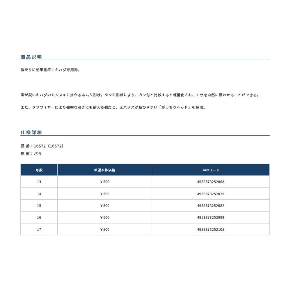 キハダ専用鈎。歯が鋭いキハダのカンヌキに掛かるネムリ形状。タタキ形状により、カン付と比較すると軽量化され、エサを自然に漂わせることができる。