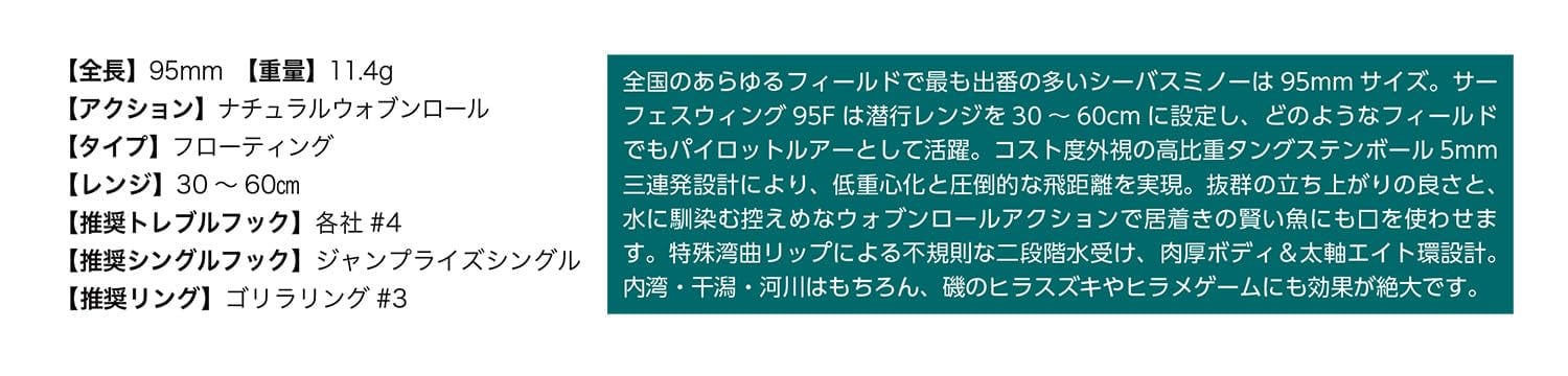 コンセプト:「サーフェスウィング 95F」……高比重タングステンボール3連発設計により、95mmとは思えない超低重心化と圧倒的な遠投性能を実現。全国各地のフィールド・対象魚で活躍するパイロットルアー!!