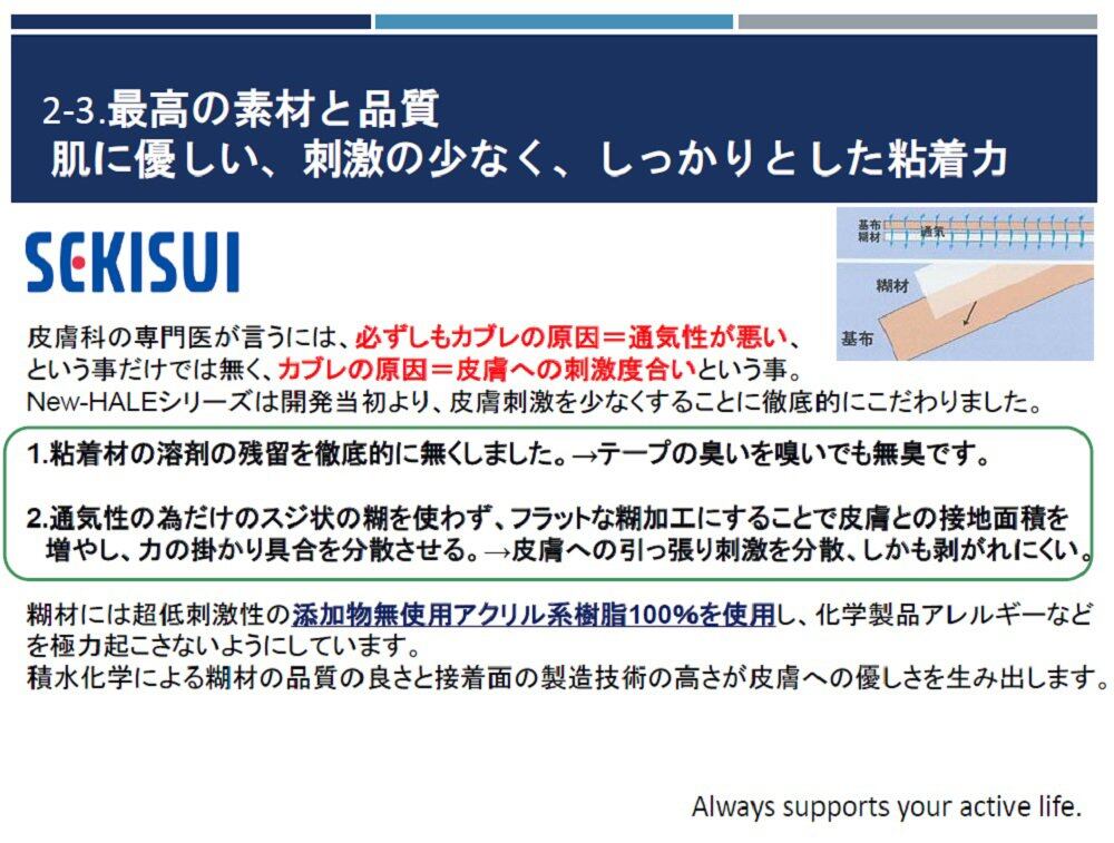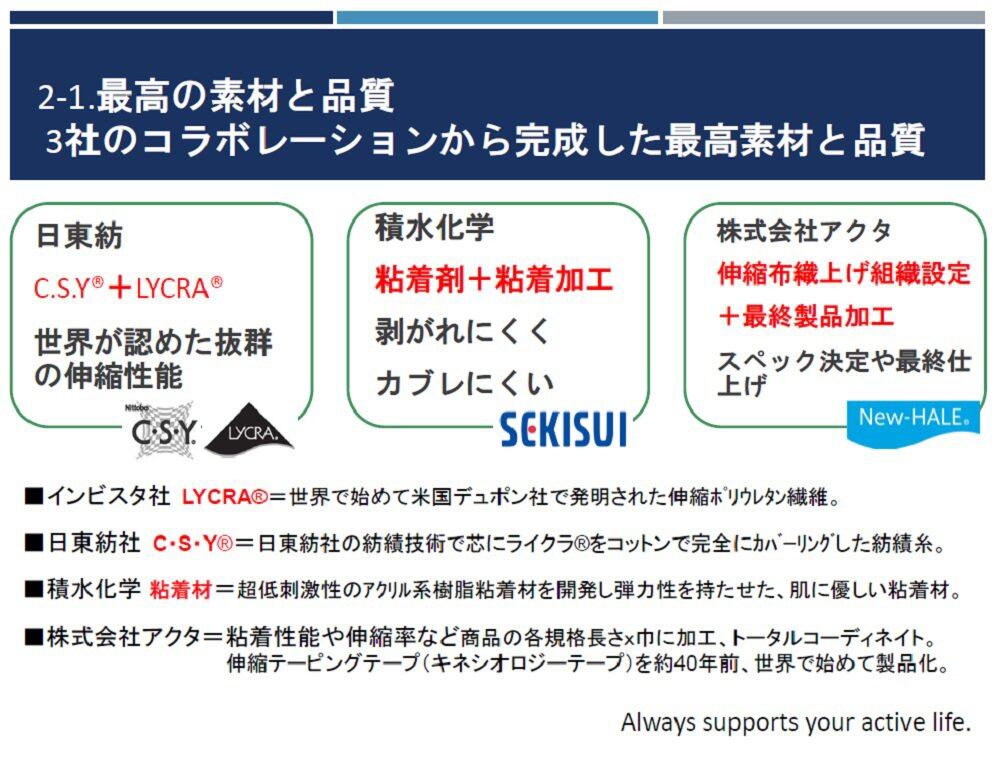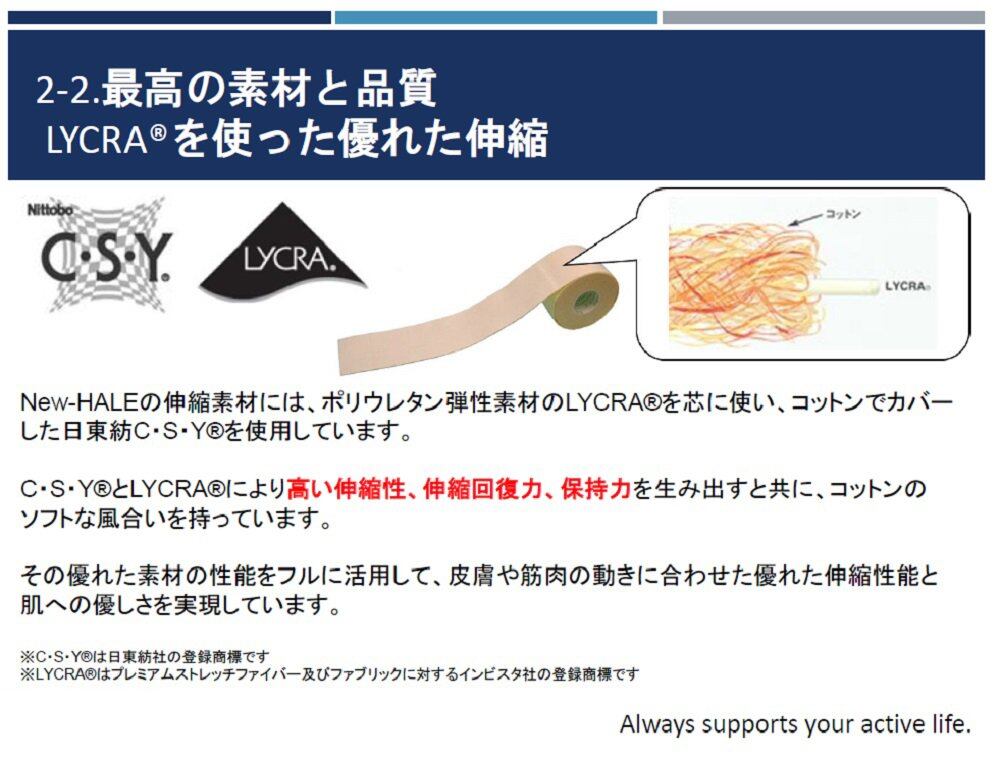 皮膚に近い約30%の適度な伸縮率とLYCRAの優れた伸張回復性により、テーピングの際に稼働範囲の調節が工夫できる固定力と、フィット感の両立を生みます。アンダーラップを使わずに従来の非伸縮ホワイトテーピングと同様に巻く事で、フィット感が持続する適度な固定ができます。また、非伸縮ホワイトテーピング使用時のアンダーラップの代わりにも使用できます。