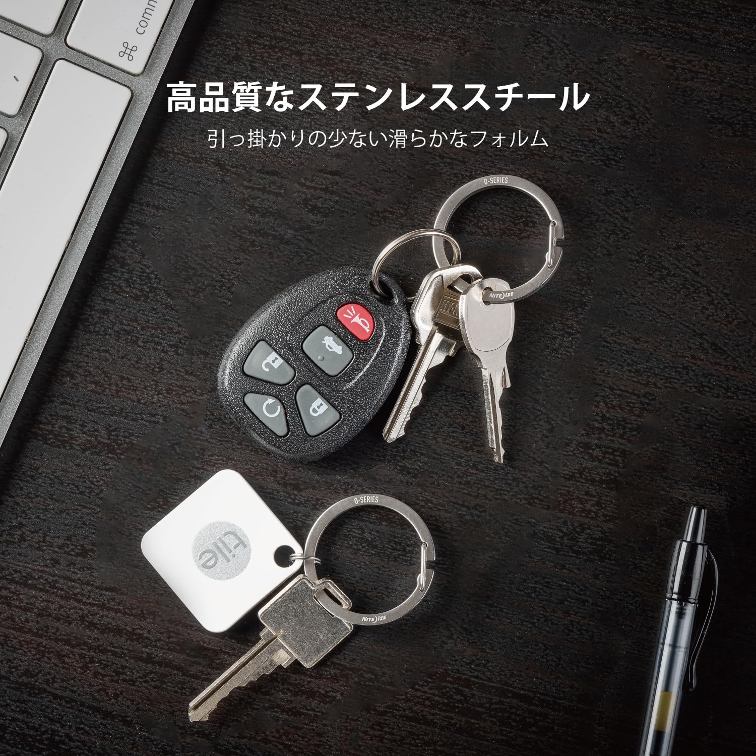 頑丈なステンレススチールのリングには小さなゲートがついており、カギやアクセサリーをワンタッチで簡単に取り付けできます。