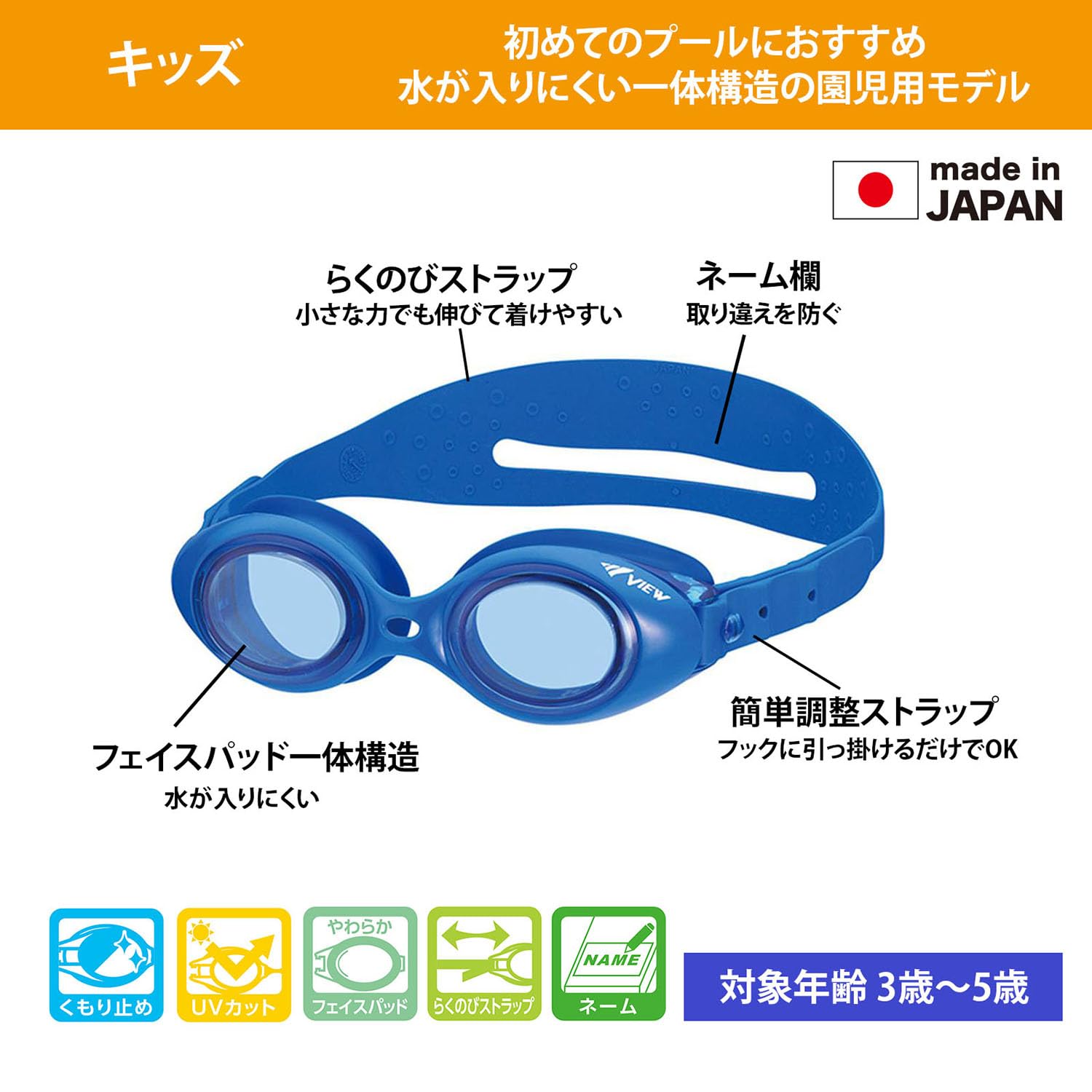 園児(子供)用サイズ。3~5歳の子供の体格・成長の平均データを基に設計。小さなお子様が使いやすく、楽しんでもらえることを目的に研究・開発したゴーグル。小さなお子様ひとりでも、お父さんやお母さんからでも着けやすく、ストラップの調整が簡単です。ストラップは従来品より伸びのある素材を使用。部分ごとに肉厚と幅を変え、ストレスの少ない装着感を実現。ストラップの後頭部に名前を書くスペースがあります。