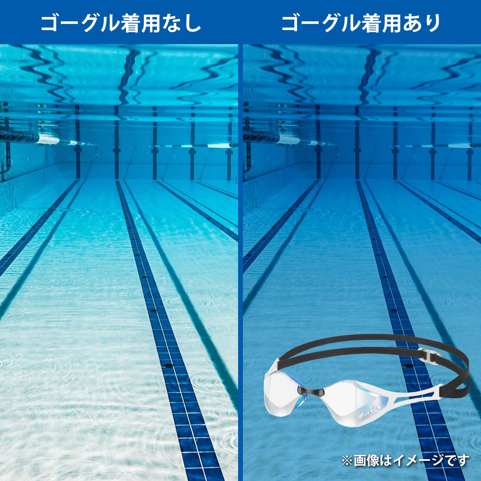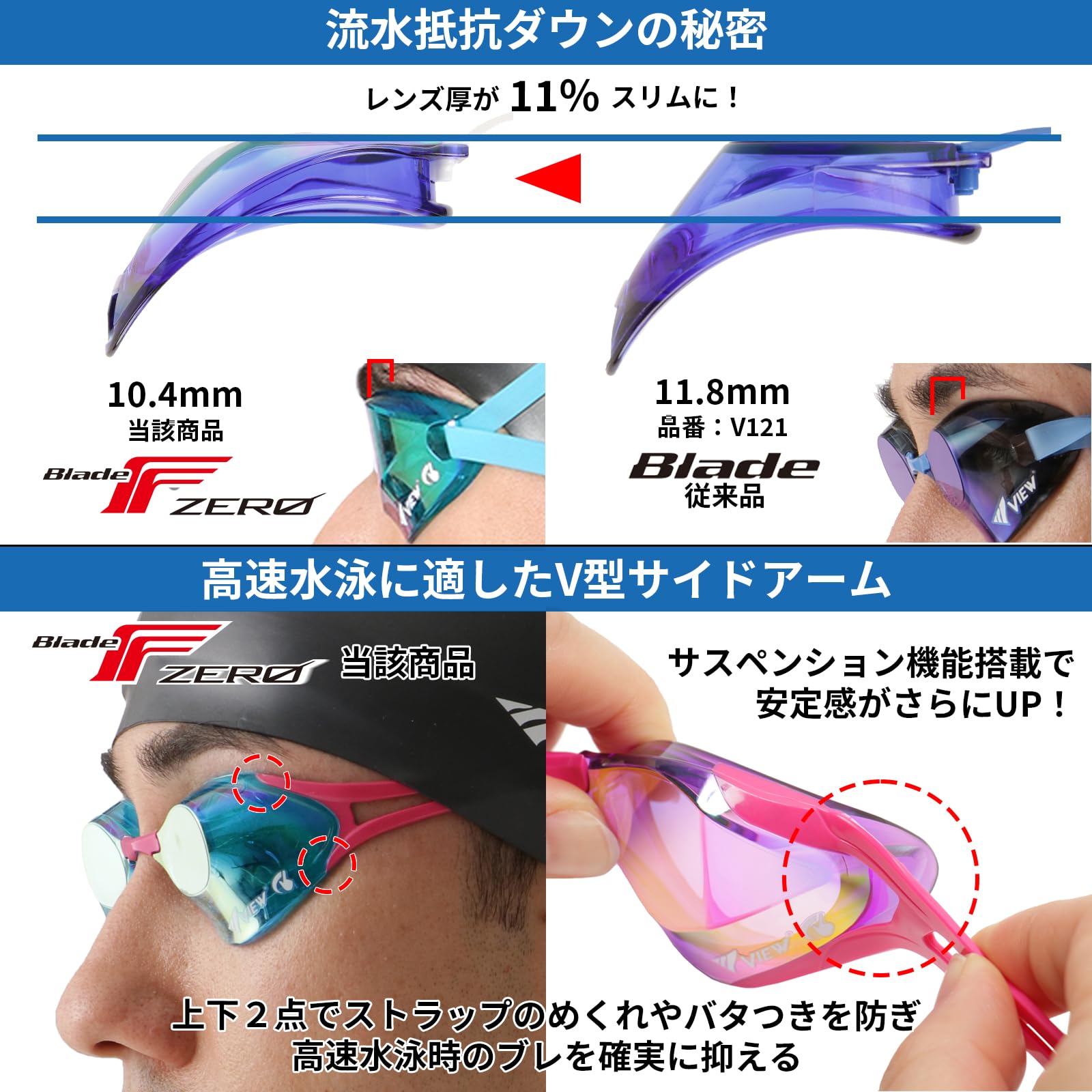 高速水泳時にもストラップのバタつきやめくれを防ぎます、レンズ上部の厚みをカットし、飛び込み時の衝撃を緩和