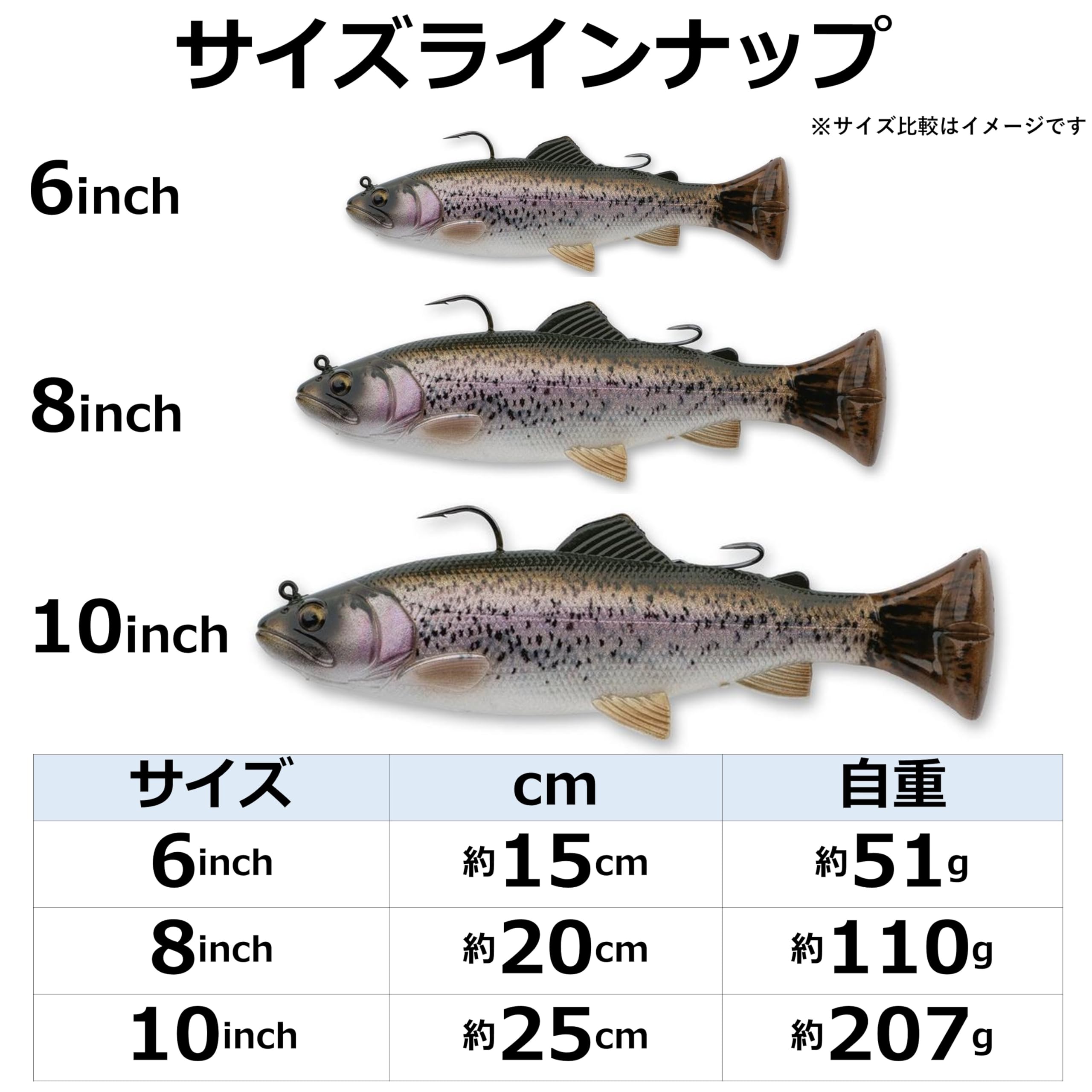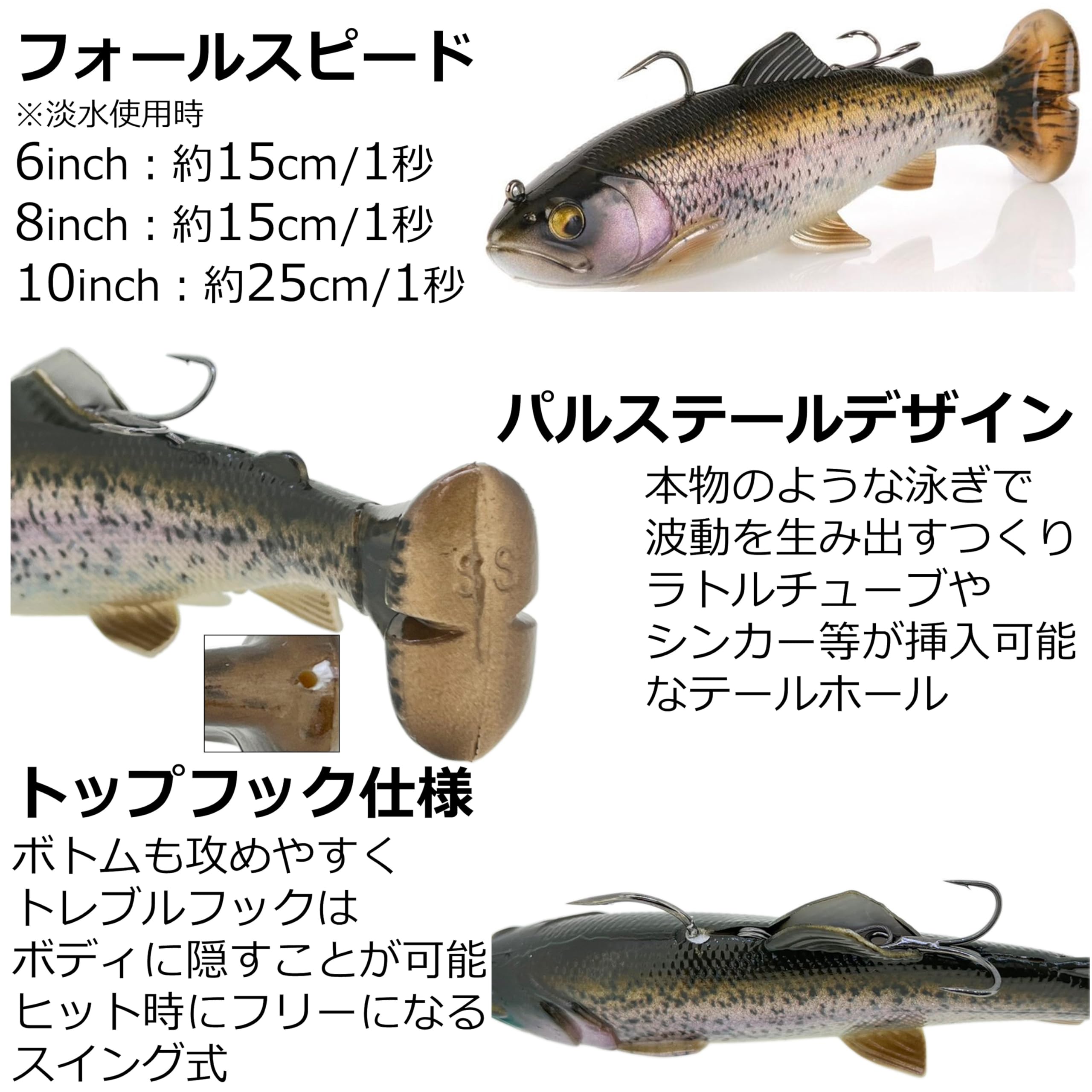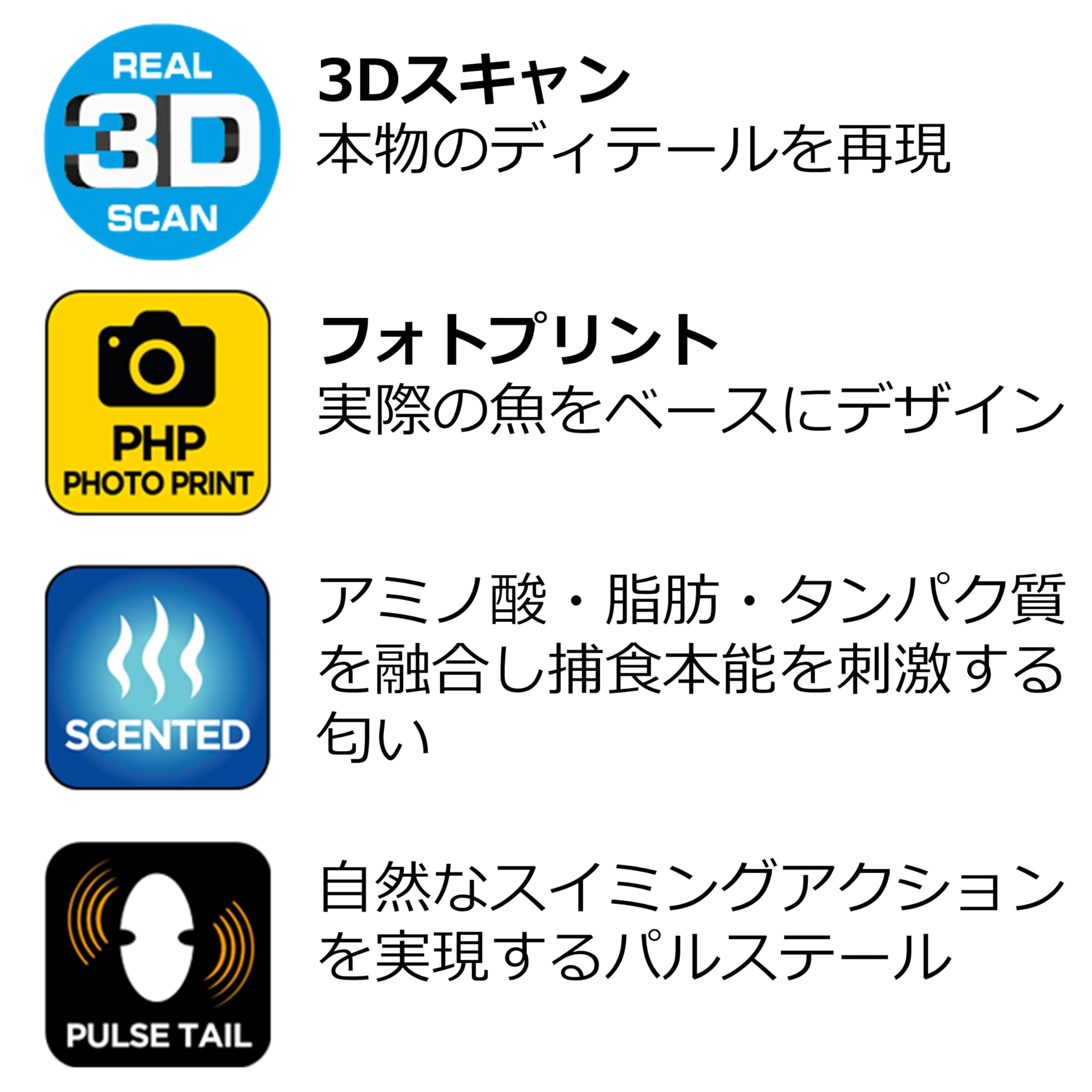 スローシンキング●素材:PVC●サイズ:約25cm●重さ:約207g●3Dスキャンによる本物のディテール再現●アミノ酸・脂肪・タンパク質を融合した捕食本能を刺激する匂い●実際の魚をベースにしたフォトプリント