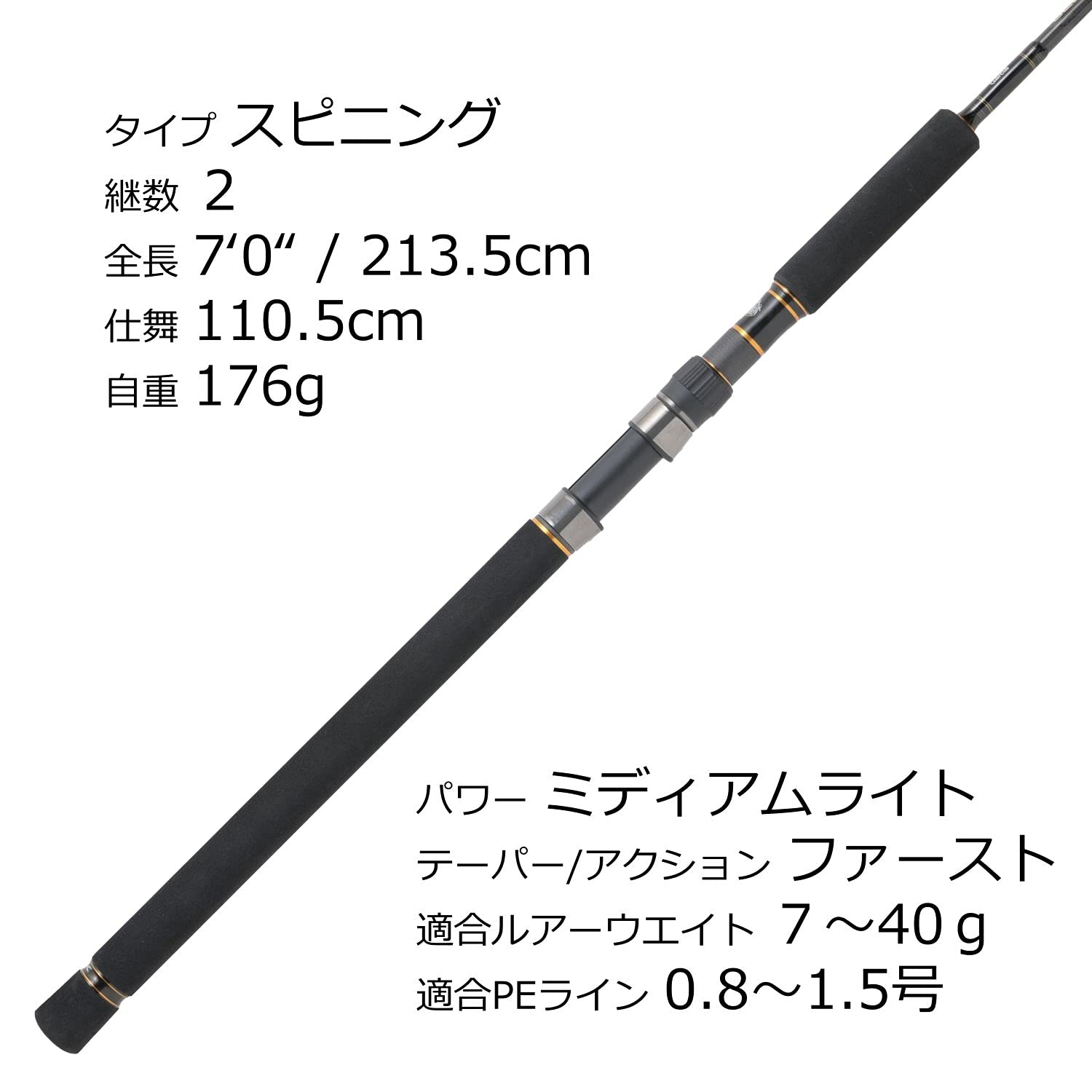 全長:7.0フィート(約213.5cm) / 仕舞寸法:110.5cm / 継数:2本 / 自重:176g