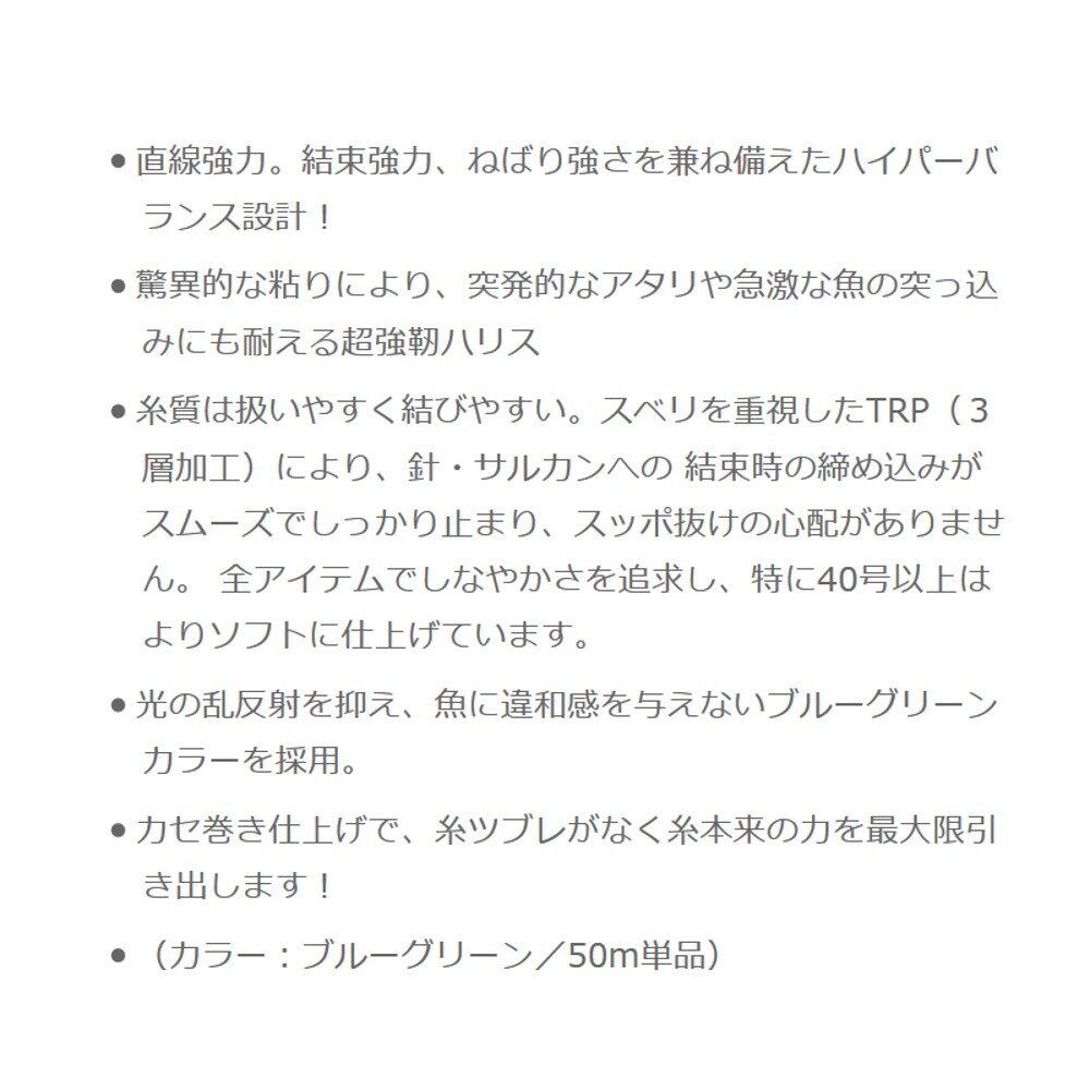 ●直線強力。結束強力、ねばり強さを兼ね備えたハイパーバランス設計! ●驚異的な粘りにより、突発的なアタリや急激な魚の突っ込みにも耐える超強靭ハリス。 ●糸質は扱いやすく結びやすい。スベリを重視したTRP(3層加工)により、針・サルカンへの結束時の締め込みがスムーズでしっかり止まり、スッポ抜けの心配がありません。 全アイテムでしなやかさを追求し、特に40号以上はよりソフトに仕上げています。 ●光の乱反射を抑え、魚に違和感を与えないブルーグリーンカラーを採用。 ●カセ巻き仕上げで、糸ツブレがなく糸本来の力を最大限引き出します! ※TRP(8号〜30号のみ)