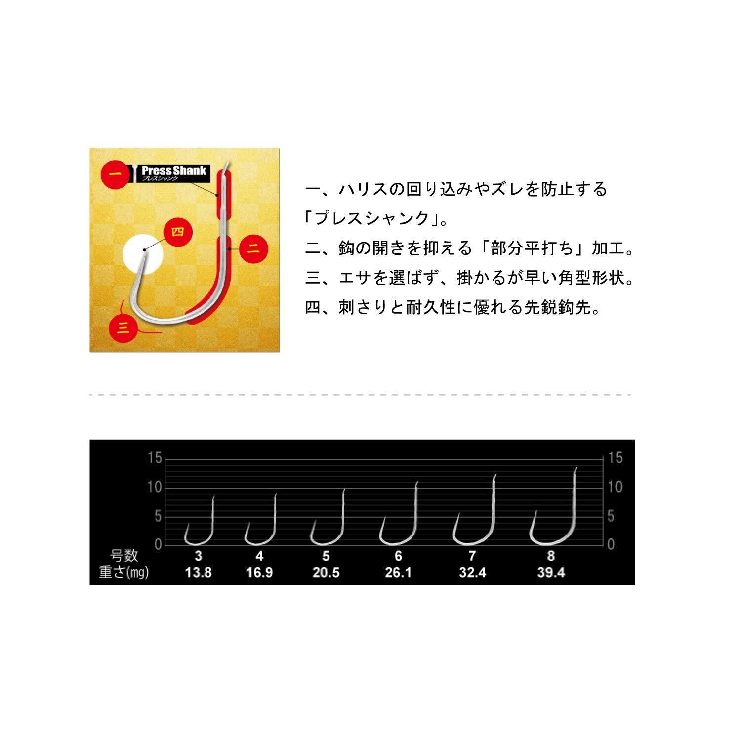 ハリス交換をスムーズにする糸付へら鈎。 しなやかで耐久性に優れるザイト・SABAKI(サバキ)へらハリス使用。 一、ハリスの回り込みやズレを防止する「プレスシャンク」。 二、鈎の開きを抑える「部分平打ち」加工。 三、エサを選ばず、掛かるが早い角型形状。 四、刺さりと耐久性に優れる先鋭鈎先。