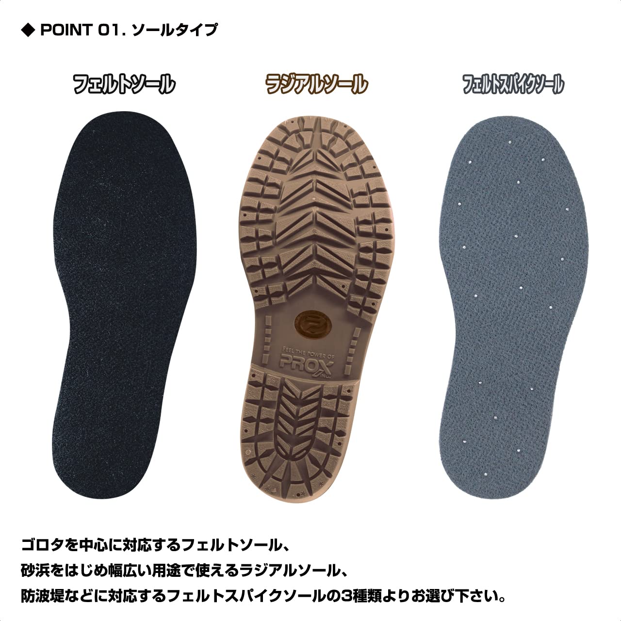 フェルトソールとラジアルソール、フェルトスパイクソールの3ソールをラインナップ。7サイズの豊富なサイズバリエーションのうち、3S/SSサイズは女性やお子様にも最適。