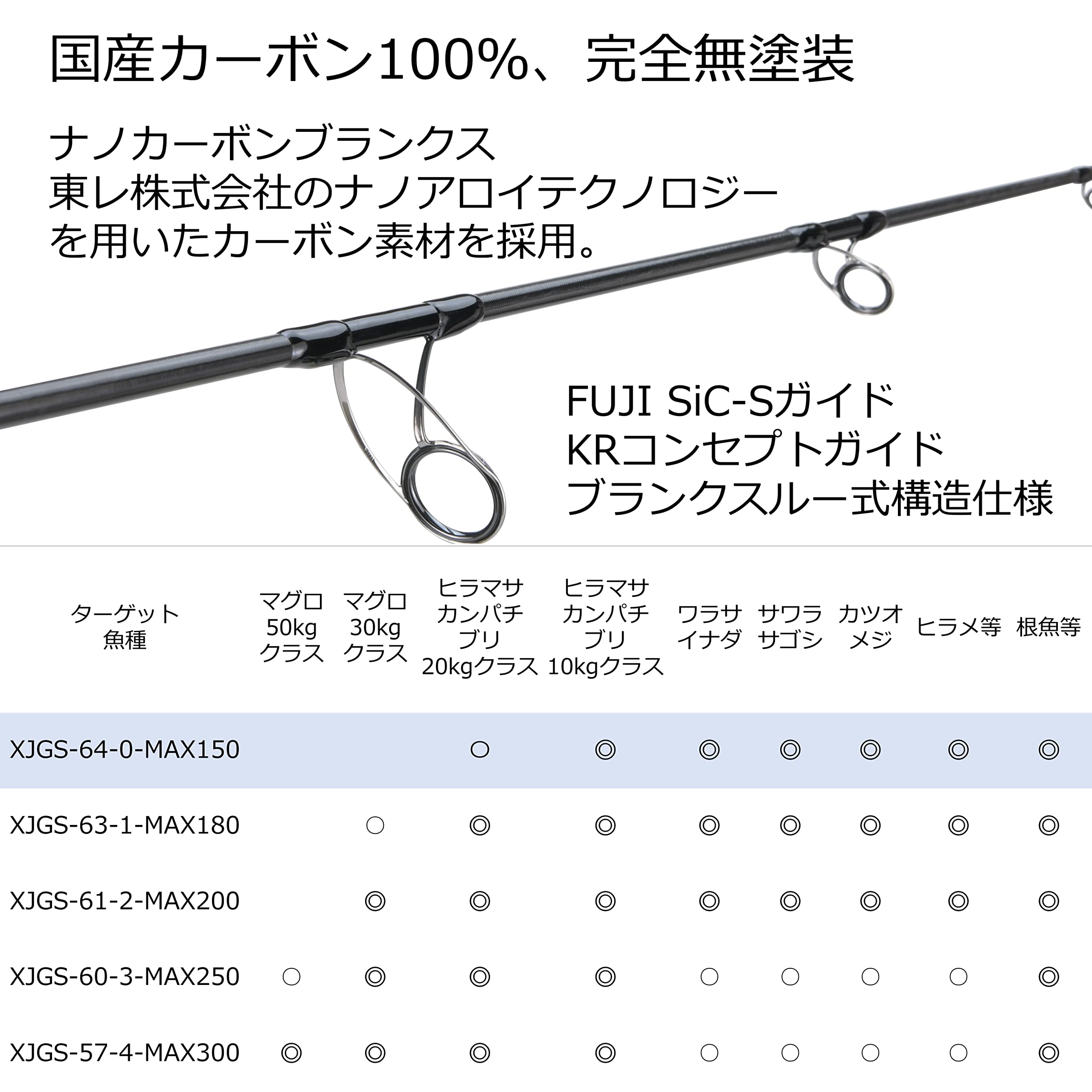 仕舞(cm)193●標準自重(g)133●先径(mm)1.62●ルアー(g)~150●リーダーライン(lb)~50●PE Line(号)~2.5●パワー0