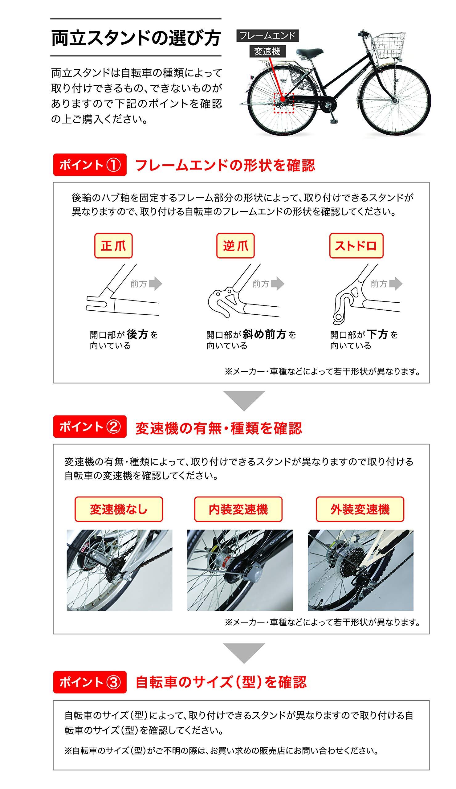 正爪の自転車であっても変速機なし、内装変速機付自転車には装着できません(詳しくは製品案内画像の両立スタンドの選び方、適合表をご覧ください)