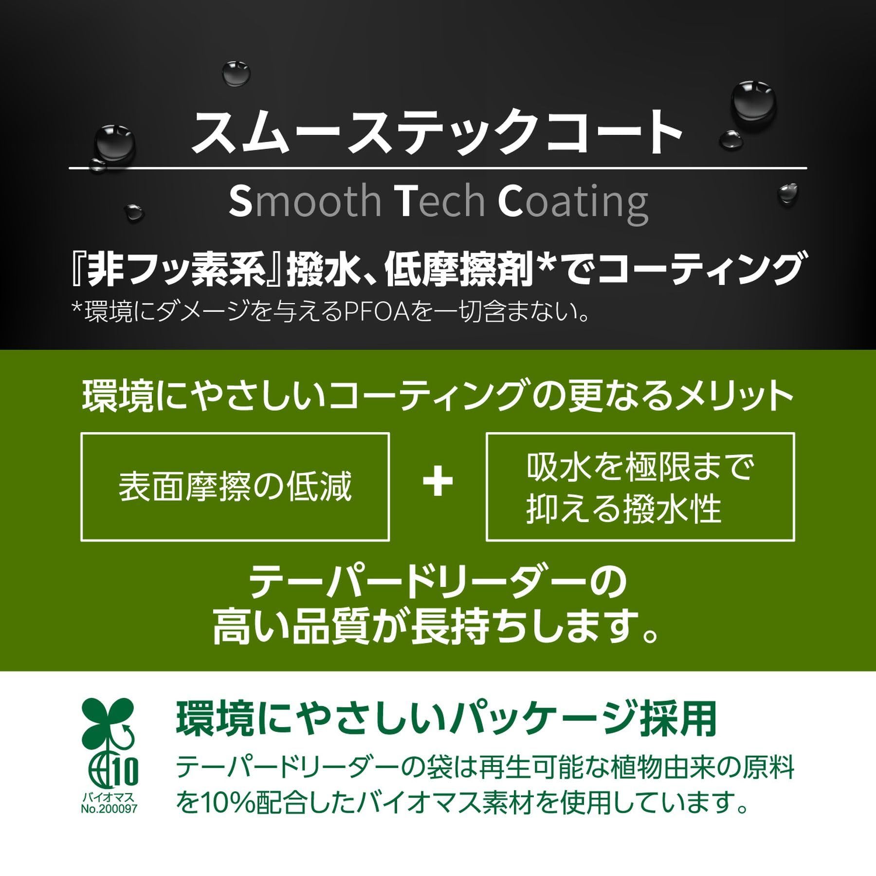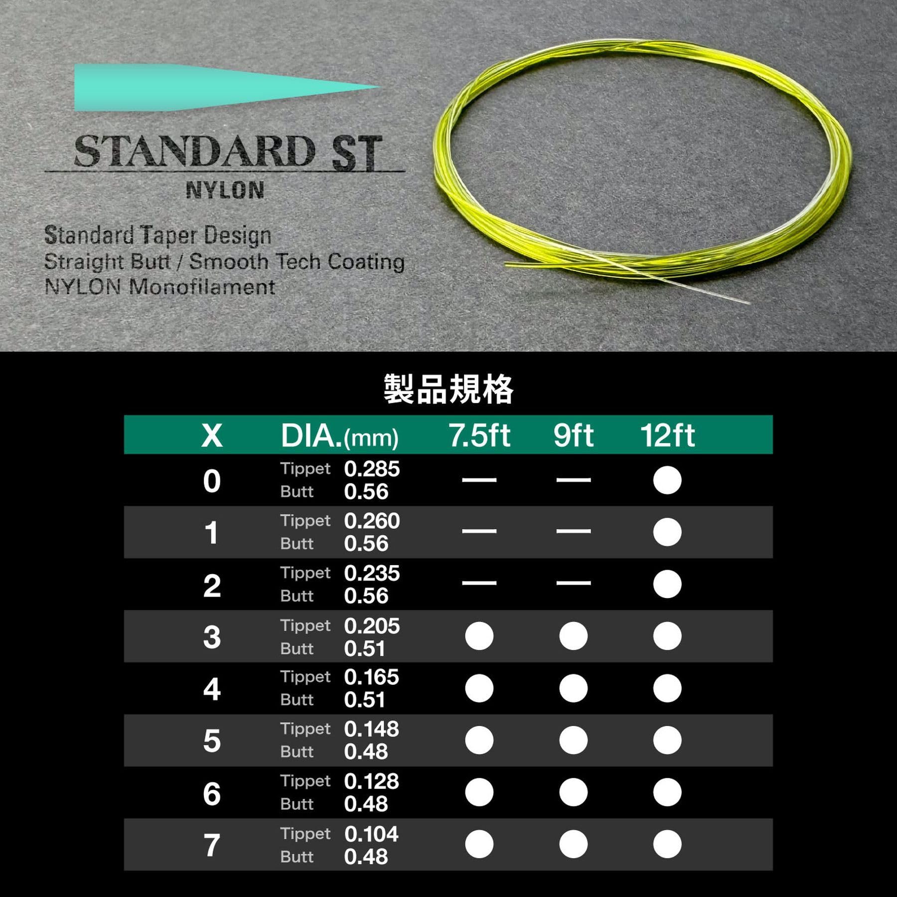 ベーシックでありながら新しいスタンダードリーダー。 VARIVASテーパードリーダー スタンダードが新しく生まれ変わりました。素材を一から見直し、新しいコーティング(スムーステックコート)と組み合わせることで、今まで以上のしなやかと高耐久性を獲得。ベテランから初心者、渓流、湖、ソルトウォーターとアングラー、フィールドを選ばない納得の仕様となっています。カラーはバット部にミスティーグリーン、ティペット部はカモフラージュ性を重視したナチュラルを採用。ティペット部の太さに合わせたより細かなバット径を採用。 ●「スムーステックコート」採用で表面摩擦を低減。さらに、吸水劣化を防ぐことで、耐久性がアップ。