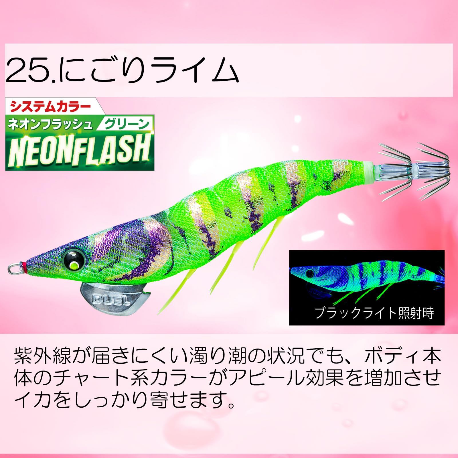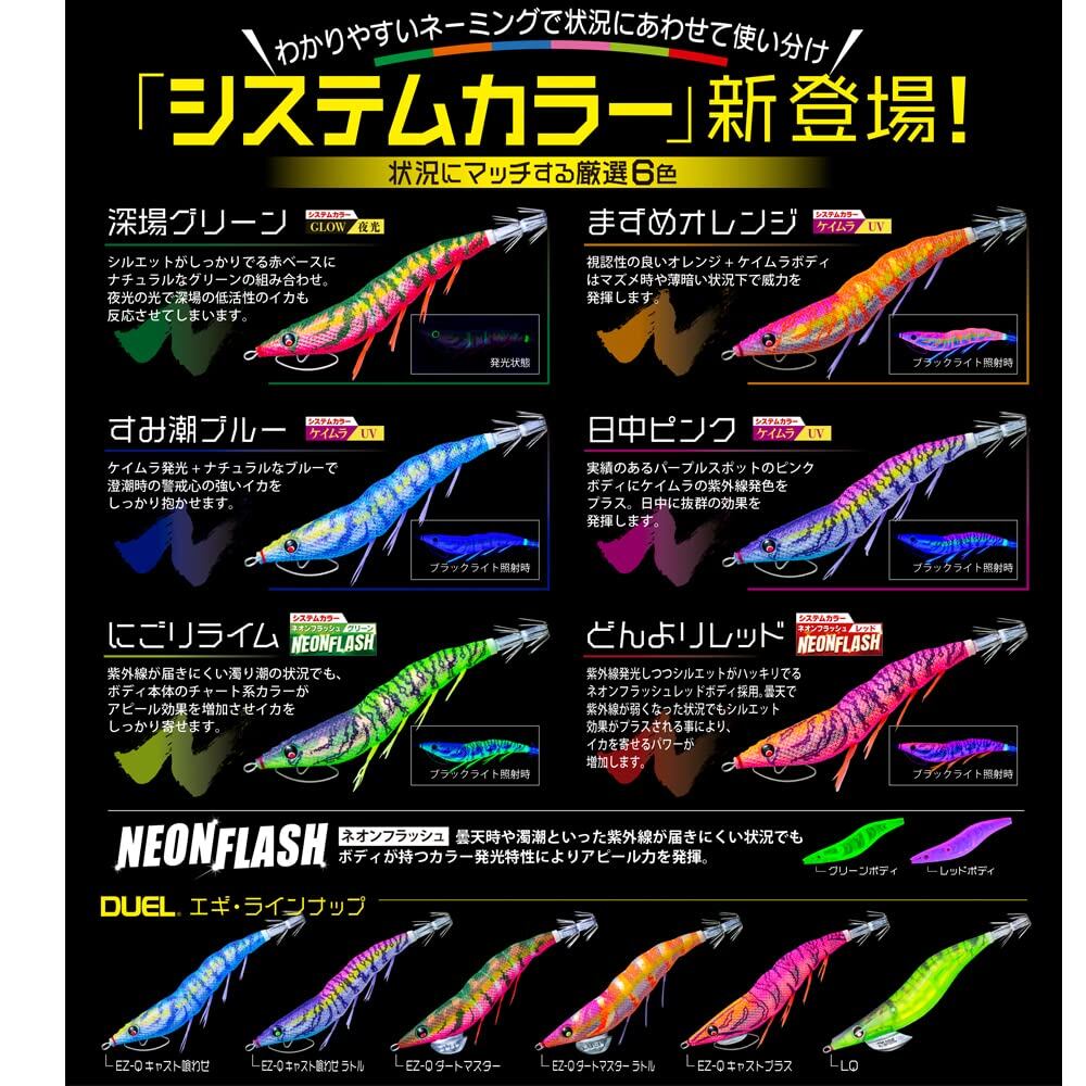 EZ-Qシリーズ史上、最強アピールの色と柄!! ●軽快ダートはそのままに「波動」「色」「音」で高活性のイカに、トリプルアピール!●色:全20色の色がスゴイ!!●音:アピール抜群のエビ音搭載!!●波動:パタパタフットライトの釣れる波動でアピール!!