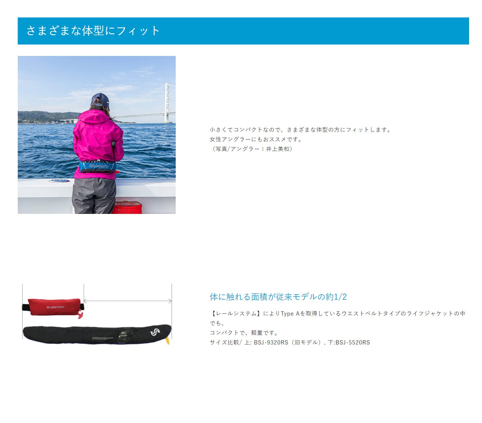 小さくてコンパクトなので、様々な体型の方にフィットします。女性アングラーにもおススメです。型式承認品タイプAを取得しています。