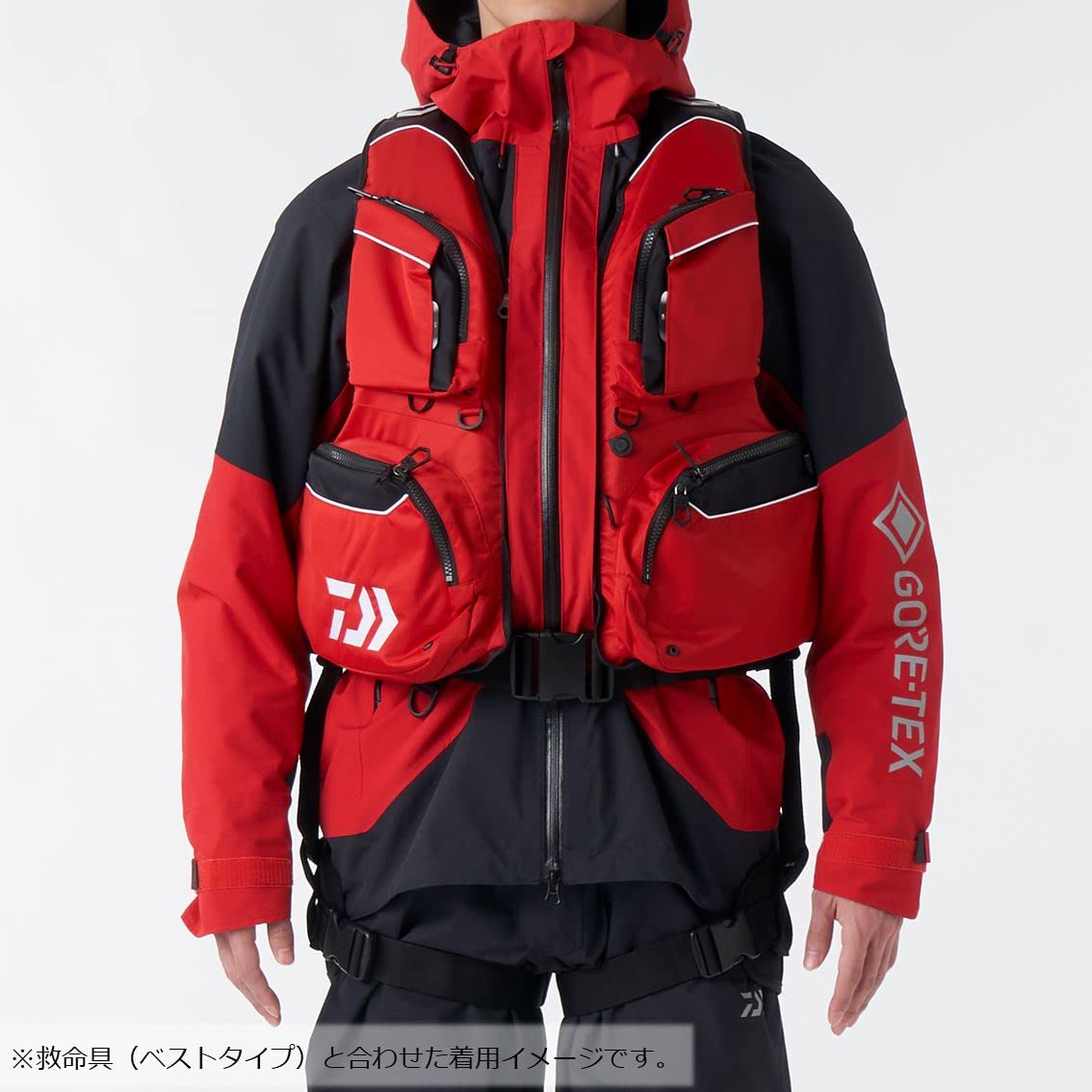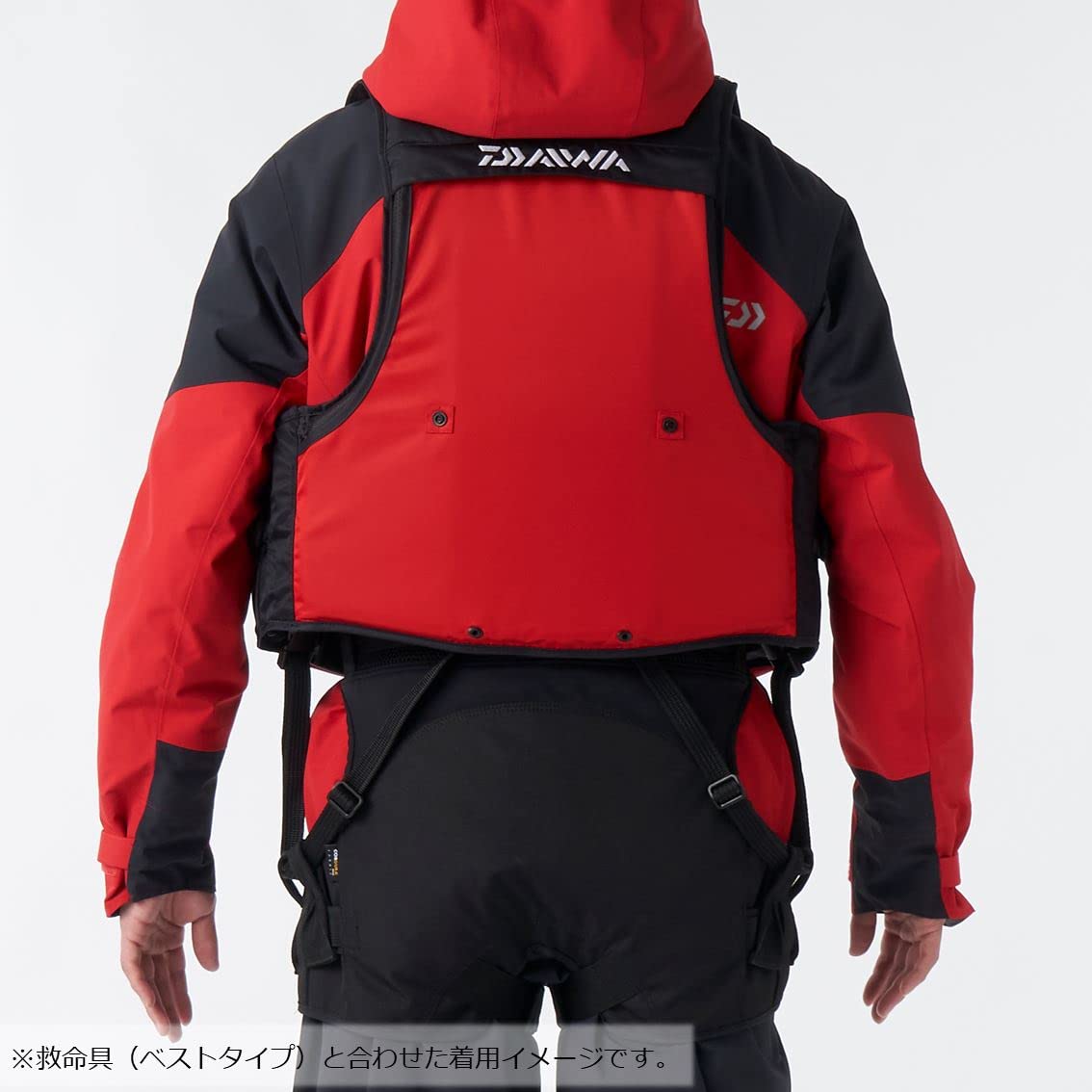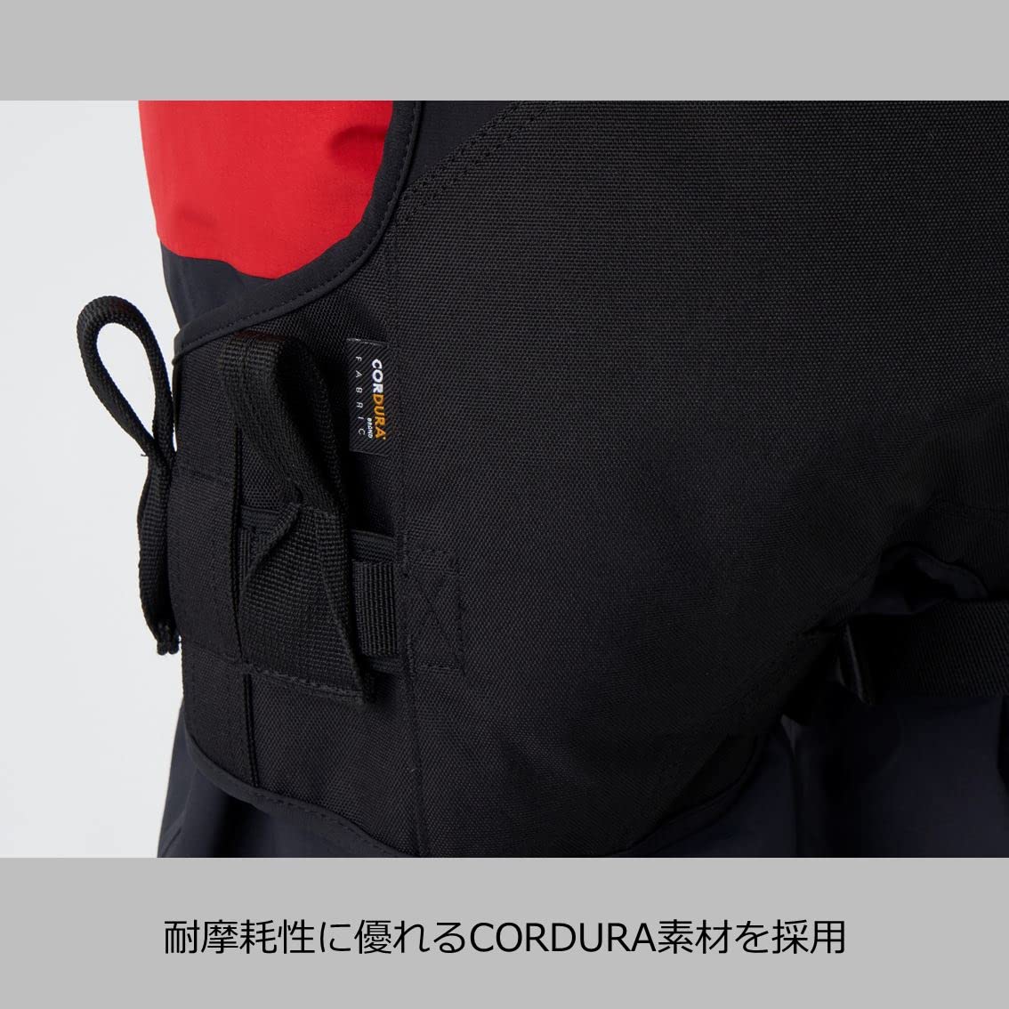 腰部分は、ストレッチ素材でフィット感&機動性確保救命具(ベストタイプ)の股ベルトを通せるループ付き救命具(ベストタイプ)と合わせて着用する際、 太ももベルトと股ベルトの重なりを軽減。