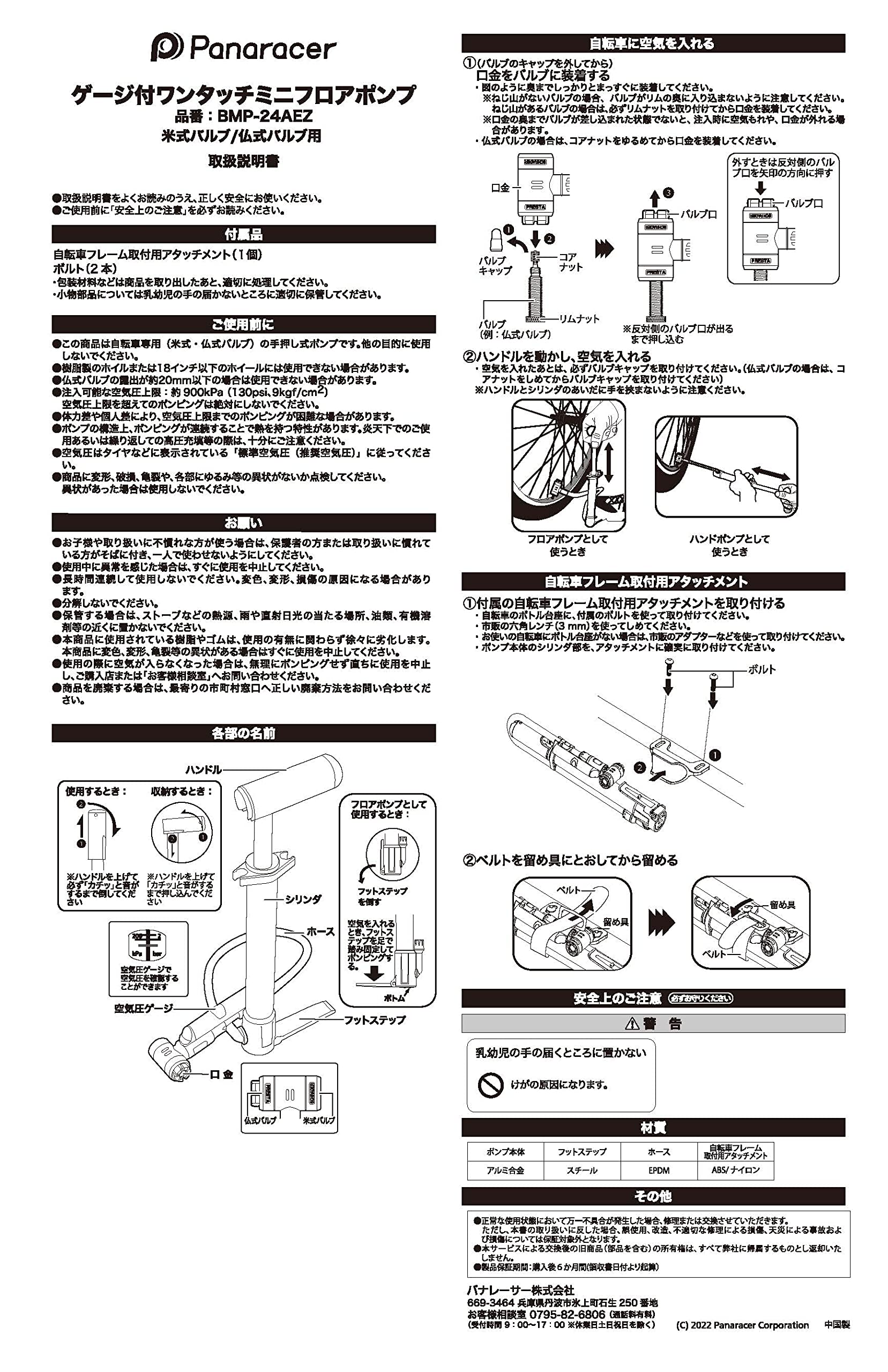 パナレーサー(Panaracer) 自転車 空気入れ ワンタッチ装着 携帯ポンプ 高圧 空気圧計付 米/仏対応 黒/シルバー