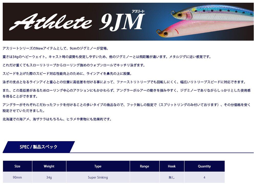 アスリートシリーズの新アイテムとして、9cmジグミノーが登場。 重さ33g。キャスト姿勢を安定させやすいため、飛距離は他のジグミノとは異なります。 メタルジグに近い感触。 そんなに重くても、スローリトリーブから強いローリングウォブンまでヘビーロールで泳げます。