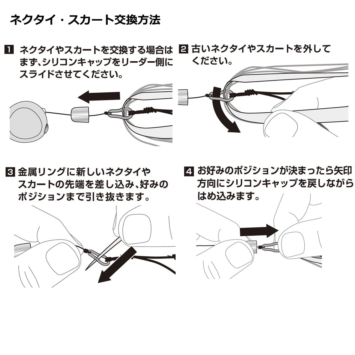 【新接続システム「βシステム」】 独自形状の金属リングとシリコンキャップにより、挟むだけでネクタイやスカートを留めることが可能。 ネクタイ・スカートやフックの簡単も容易になり、全体強度もUPしました。