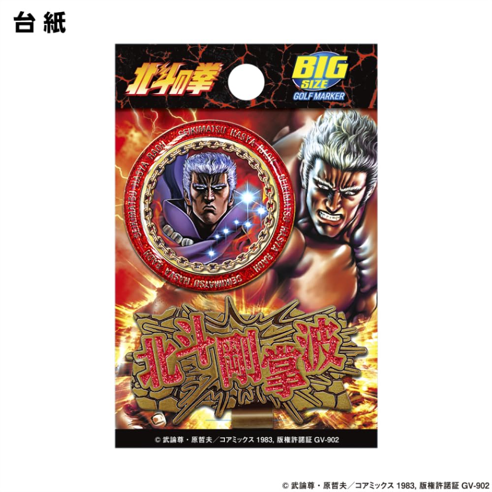 マーカーには輝く赤色の闘志を燃やすラオウと北斗七星。 台座は北斗神拳の奥義「北斗剛掌波」と北斗剛掌波のエフェクトでデザインされたゴルフ場の覇者にふさわしいマーカーとなっております。