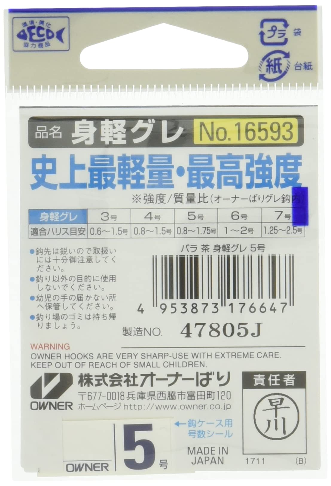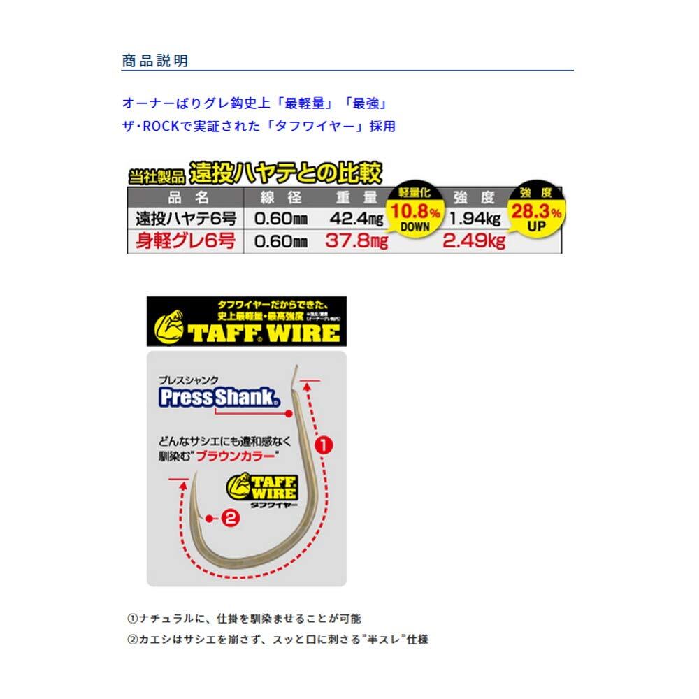 オーナーばりグレ鈎史上「最軽量」「最強」ザ・ROCKで実証された「タフワイヤー」採用1ナチュラルに、仕掛を馴染ませることが可能2カエシはサシエを崩さず、スッと口に刺さる"半スレ"仕様<なぜ軽量化が必要なのか?>昨今のグレは沖の潮目に浮遊し、ゆっくり沈下する刺しエサに反応しやすいと言われています。また上下運動による活発は捕食活動が減少し、横側からついばむような捕食をするため、ハリからハリスまでの距離を水平に保たないとアタリがとりづらい。そのようなことから、軽量化されたフックが必要とされたことも開発の背景です。