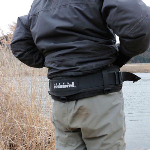 アングラーの腰をしっかりとやさしくサポート。左右のベルトを引いて腰にフィットさせます。