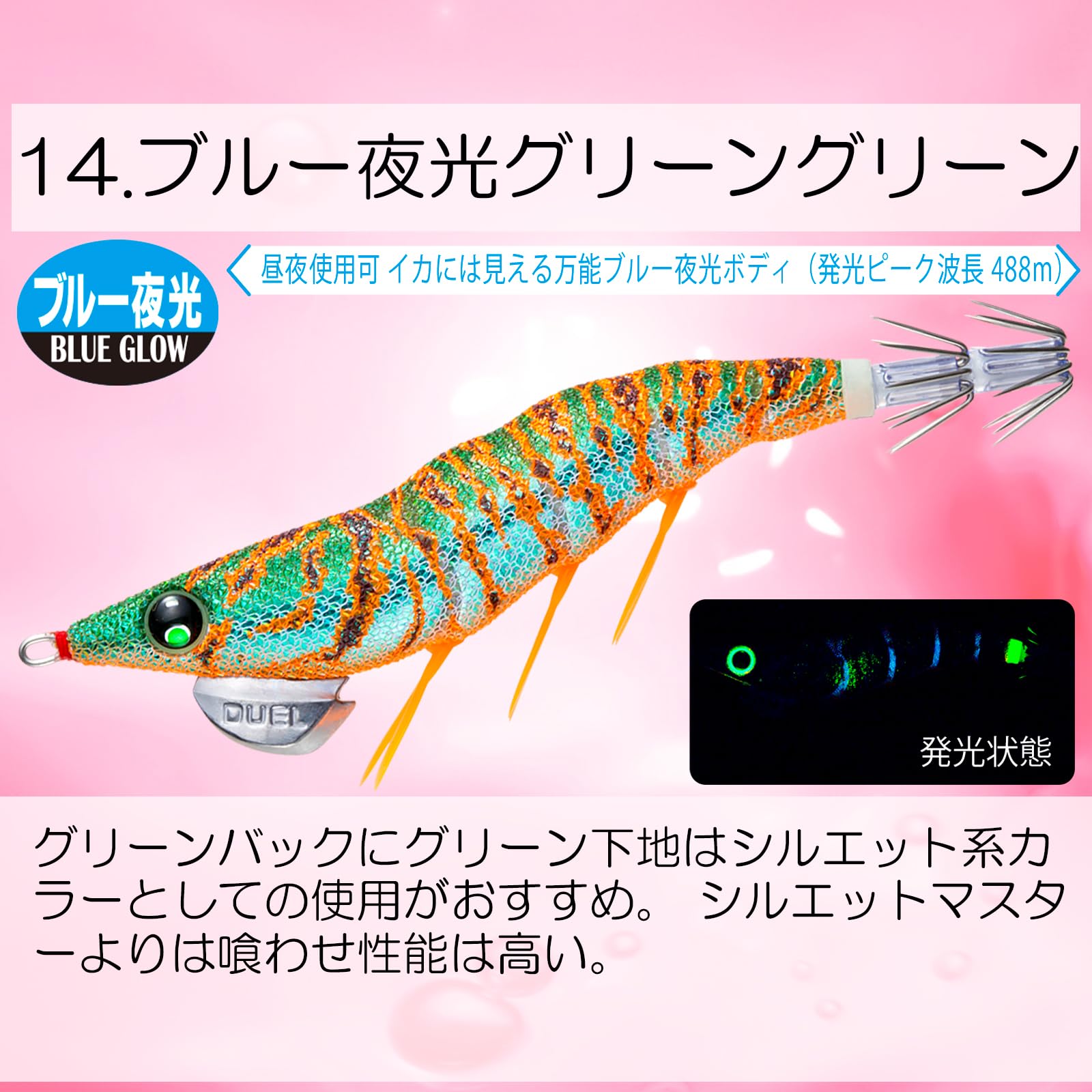 【NEW】一目でわかる ボディカラー表示:昼夜使用可 イカには見える万能ブルー夜光ボディ(発光ピーク波長 488mm)