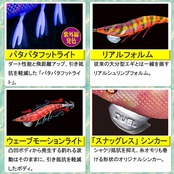 EZ-Qシリーズ史上、最強アピールの色と柄!! ●軽快ダートはそのままに「波動」「色」「音」で高活性のイカに、トリプルアピール!●色:全20色の色がスゴイ!!●音:アピール抜群のエビ音搭載!!●波動:パタパタフットライトの釣れる波動でアピール!!