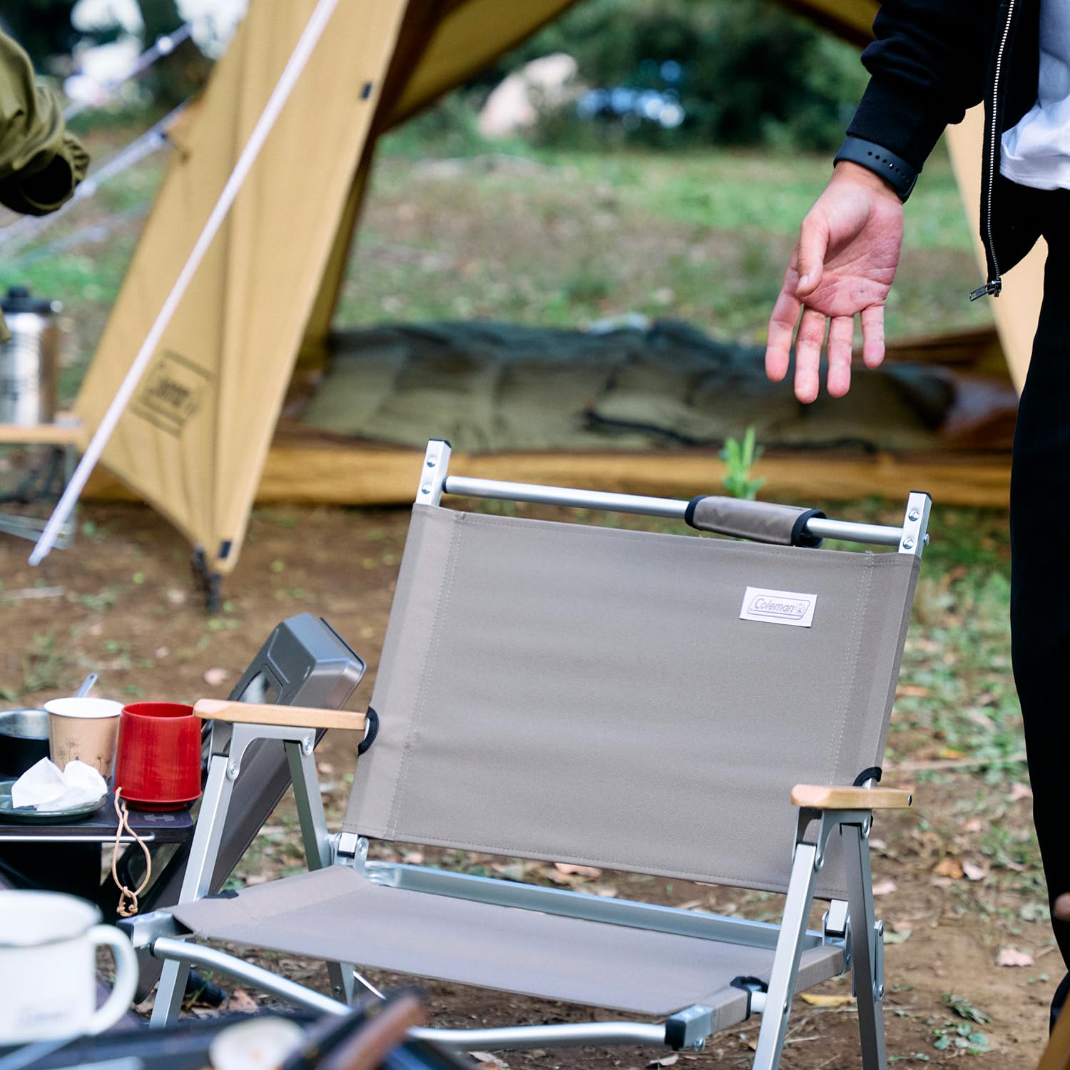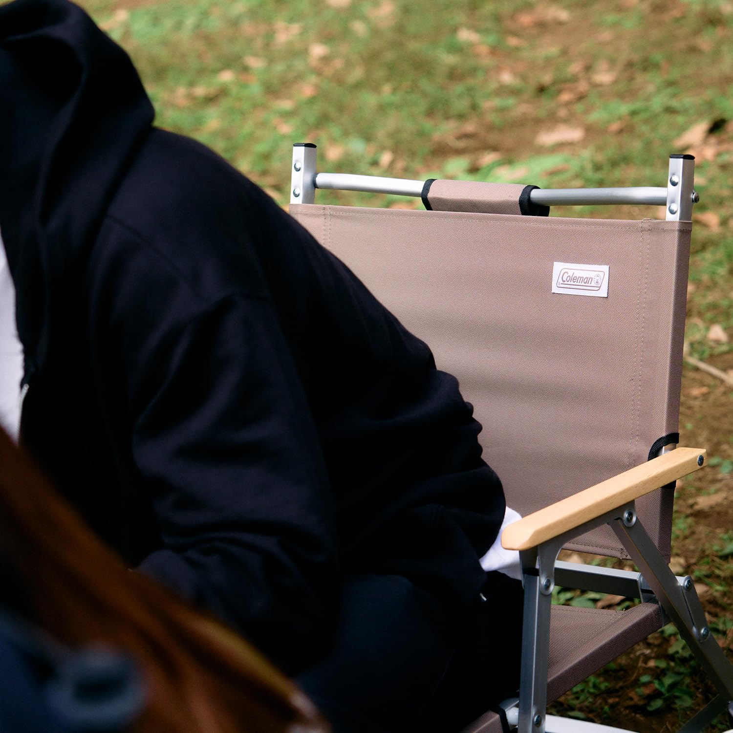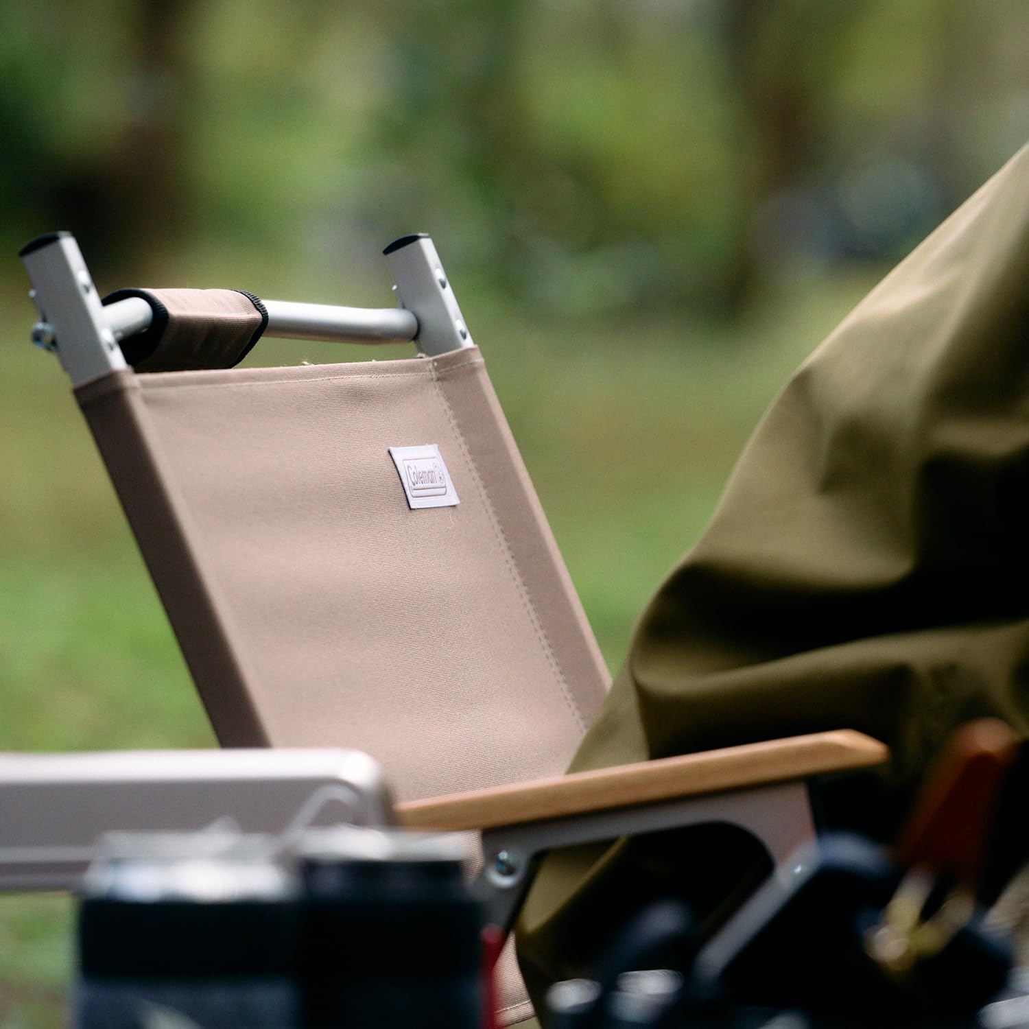 【キャンプ用椅子】燃えにくい生地で焚火シーンに適した座り心地のいいロースタイルチェア。肌触りの良いウッドアームレスト。