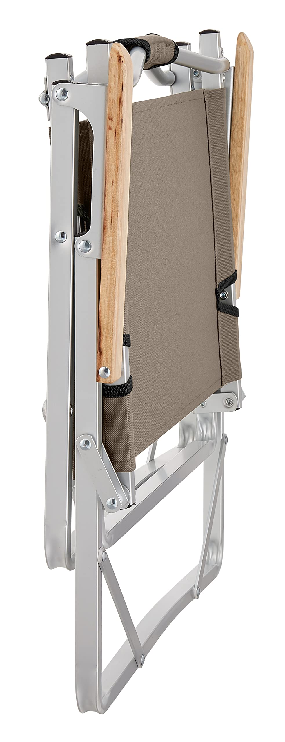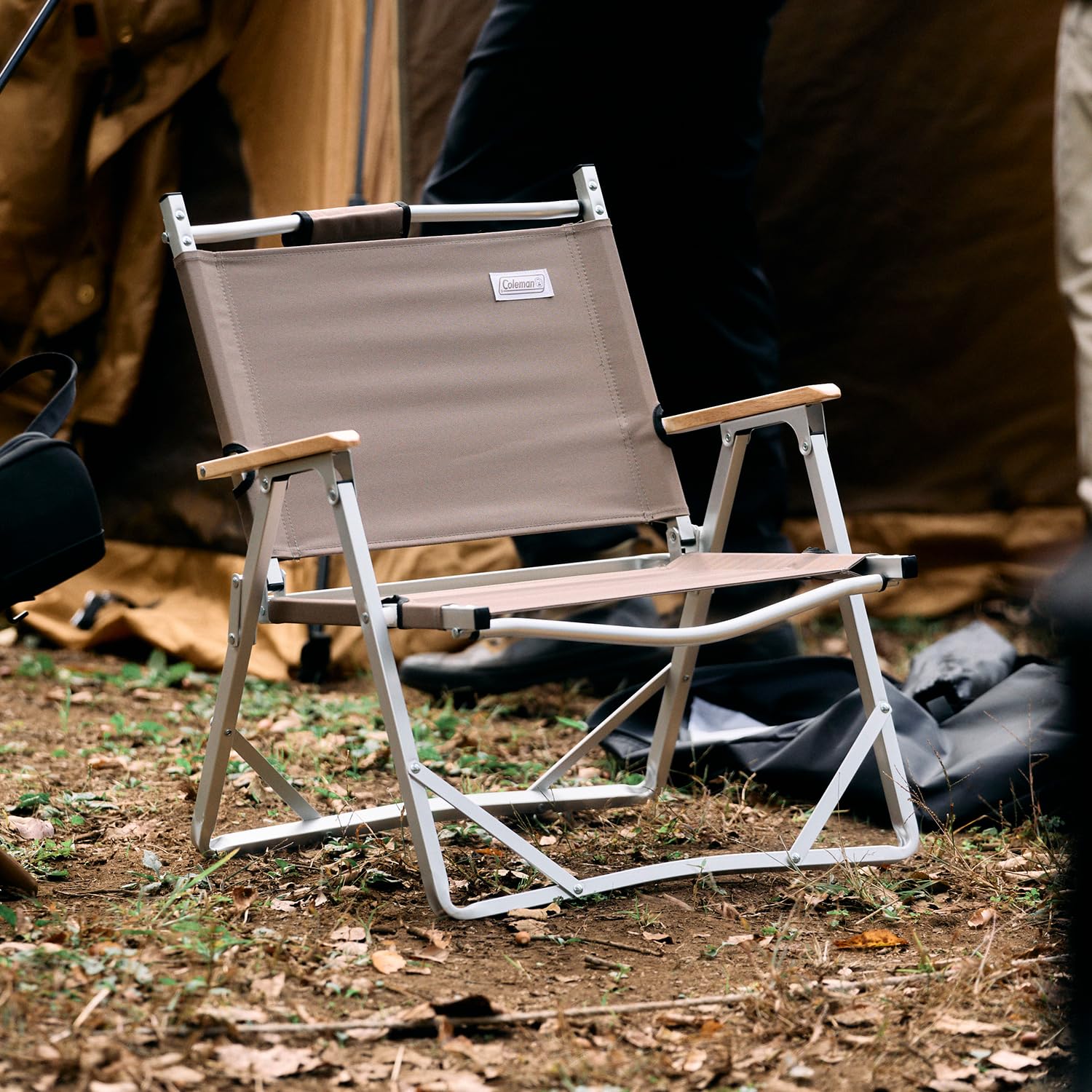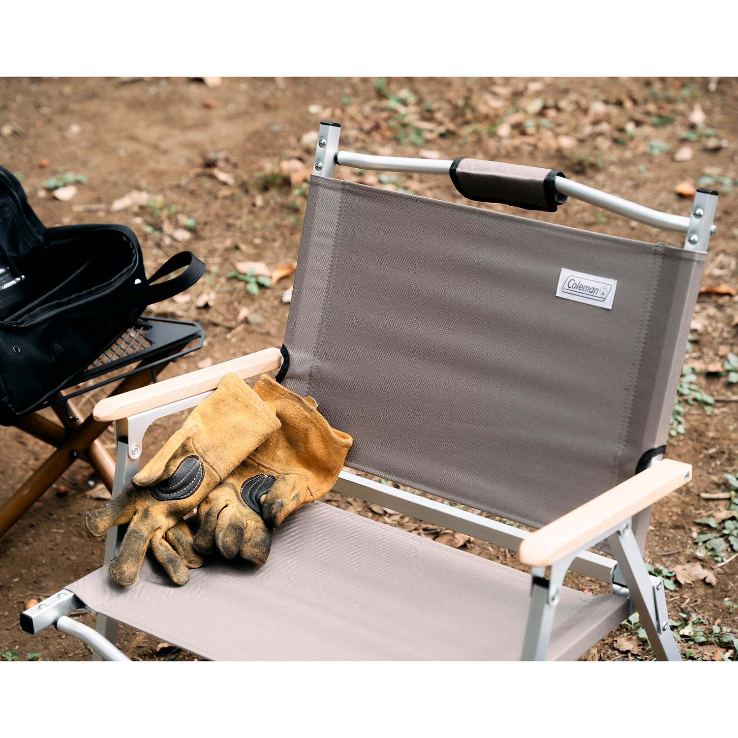 【キャンプ用椅子】燃えにくい生地で焚火シーンに適した座り心地のいいロースタイルチェア。肌触りの良いウッドアームレスト。
