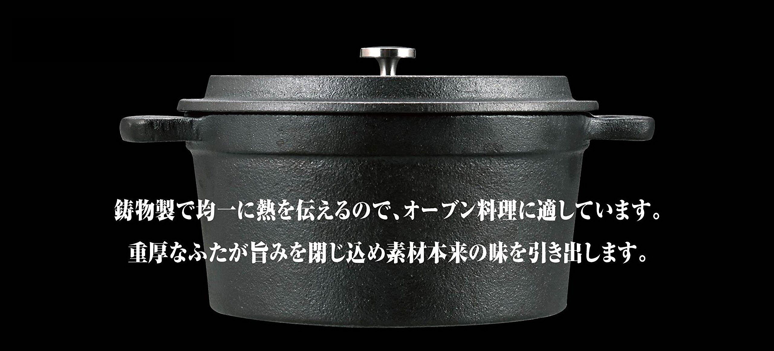 材質:表面加工/油焼き(焼付塗装)、材料の種類/本体・ふた=鉄鋳物、その他の材料/つまみ=ステンレス鋼
