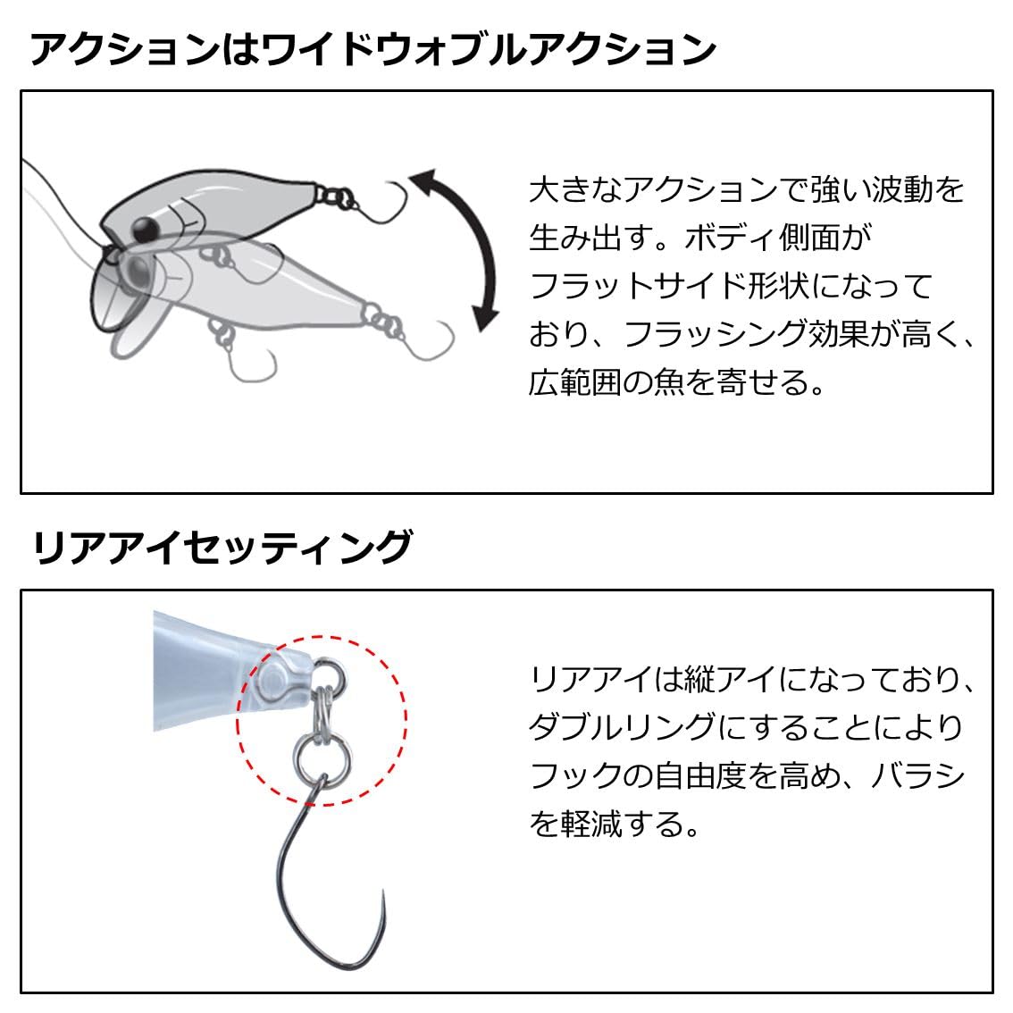 ワイドウォブルアクション(フローティング) 大きなアクションで強い波動を生み出す。ボディ側面が フラットサイド形状になっており、フラッシング効果が高く、 広範囲の魚を寄せる。