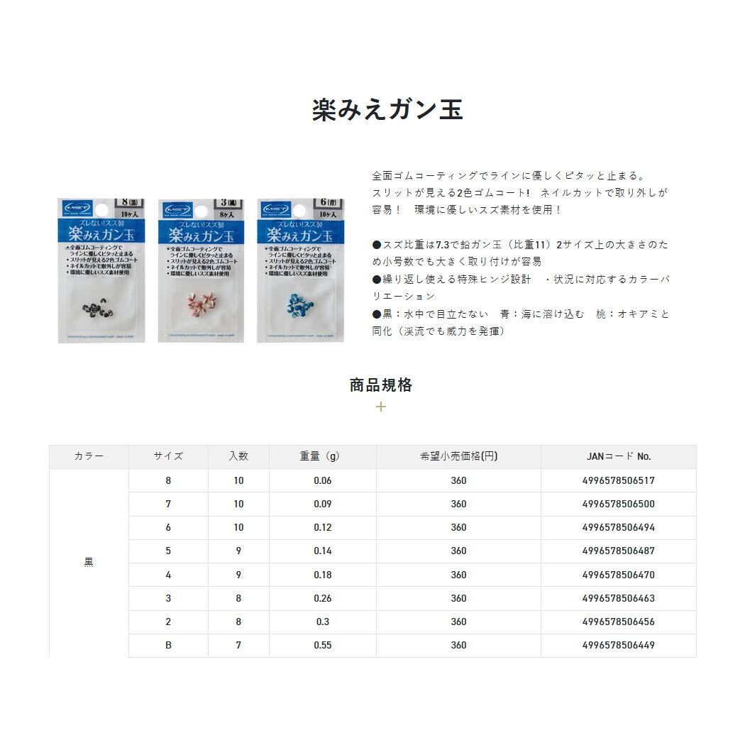 ●スズ比重は7.3で鉛ガン玉(比重11)2サイズ上の大きさのため小号数でも大きく取り付けが容易