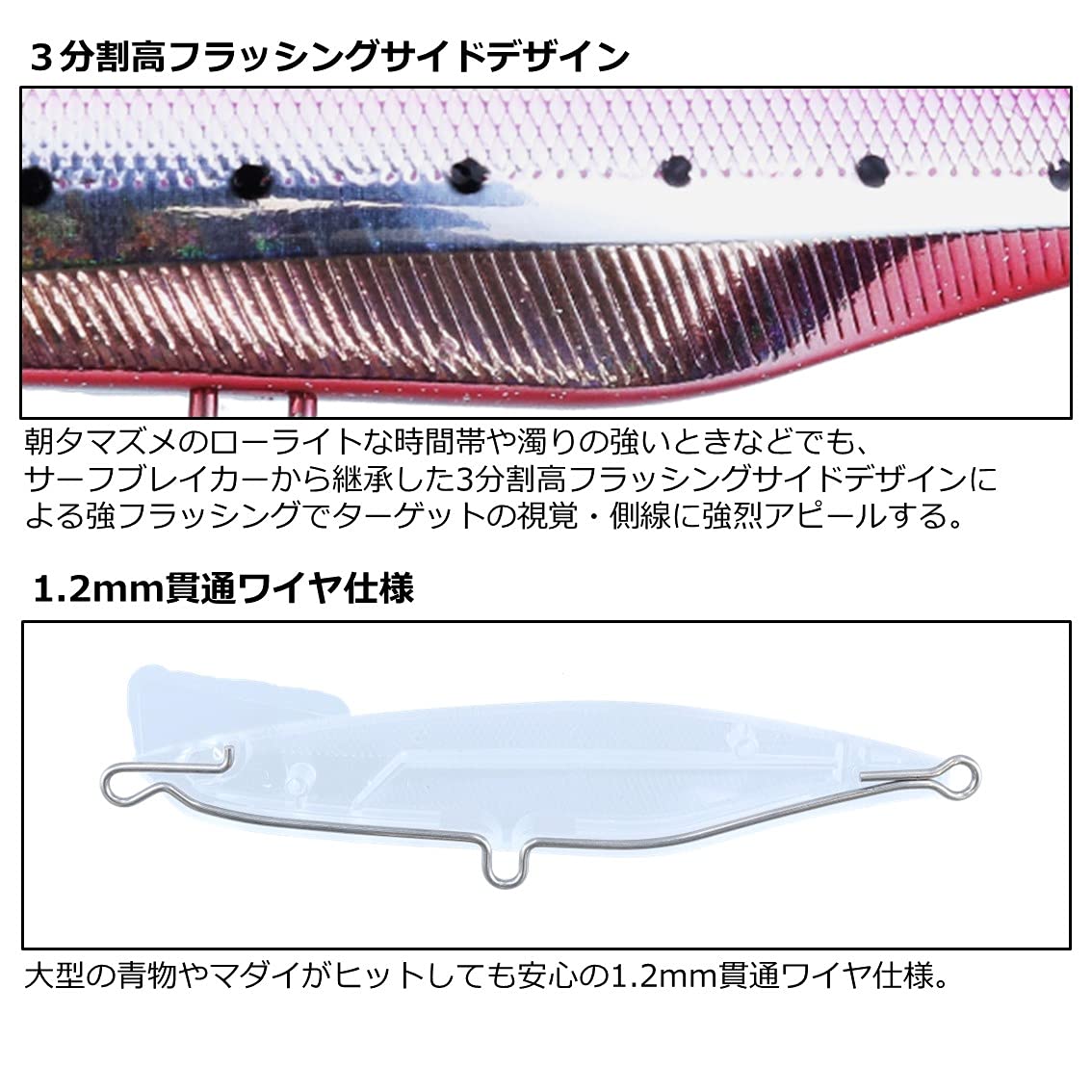 ヒラメ&マゴチからシーバス、青物まで幅広く狙える、超ぶっ飛びのバーサタイルヘビーシンキングペンシル! スローリトリーブではヒラメ&マゴチ、シーバスに有効なワイドテールスイングアクション、高速リトリーブでは青物に有効なイレギュラーローリングアクションにシフトチェンジ! 圧倒的な飛距離を実現! スローリトリーブ時はワイドテールスイングアクション。高速リトリーブ時はイレギュラーローリングアクション。大型青物でも安心の1.2mm貫通ワイヤ仕様。