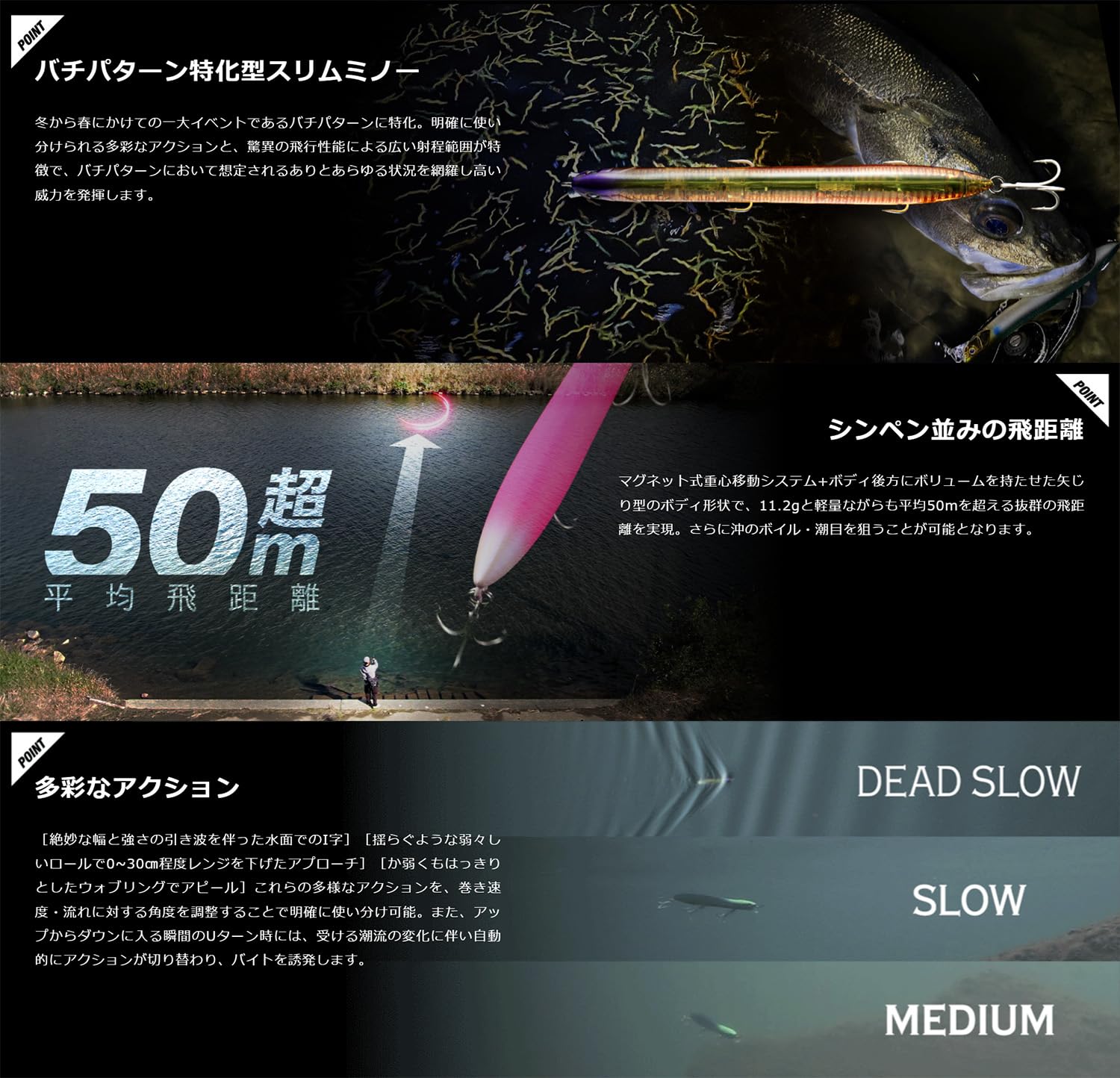 タイプ: スローフローティング (SF) / 潜行レンジ: 0〜30cm / 平均飛距離: 約50mオーバー(※PEライン0.8号/リーダー12lb/9.3フィートロッド使用時)