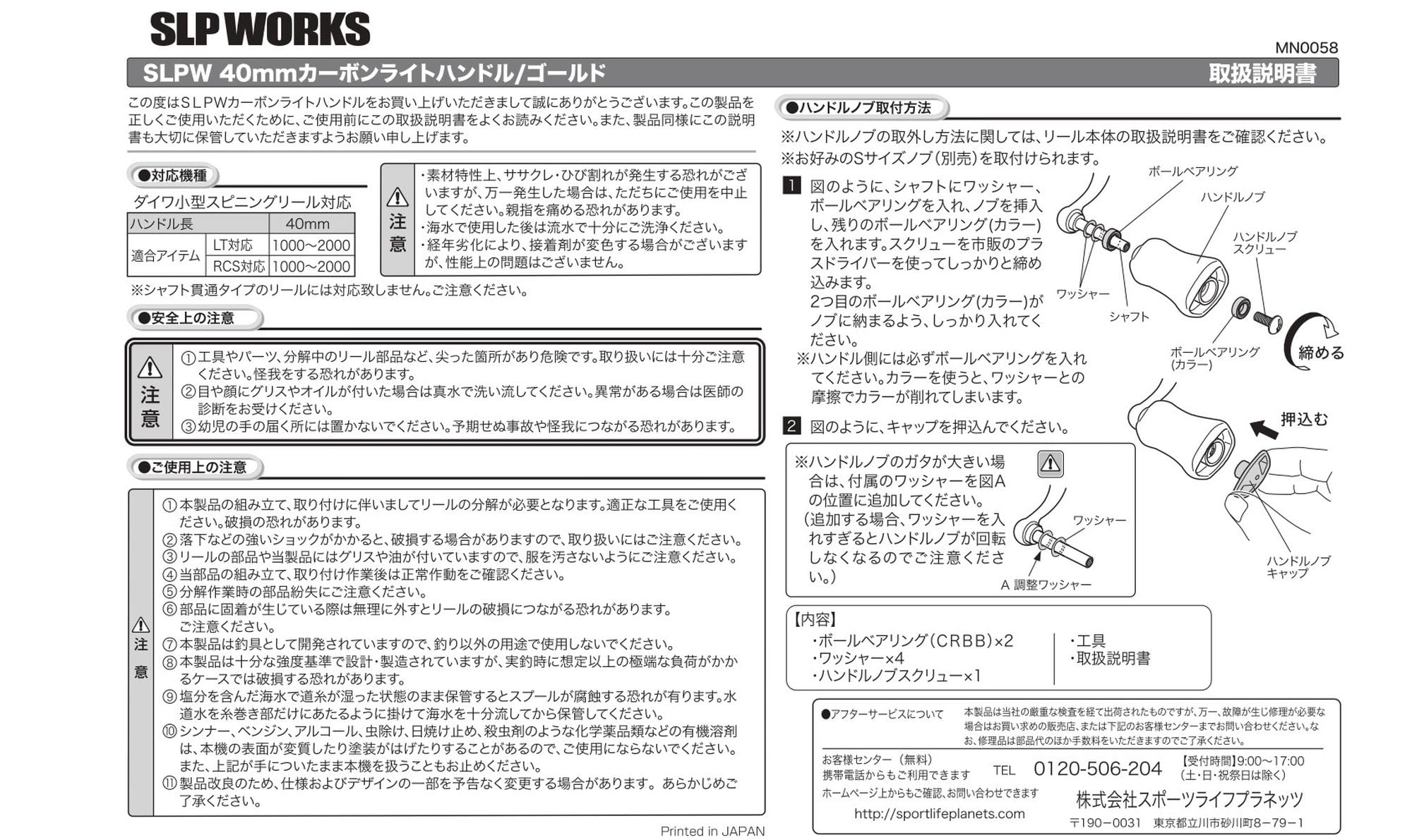 付属品:ボールベアリング(CRBB)×2、ハンドルノブスクリュー×1、ワッシャー×4、ハンドルキャップ外しピン×1