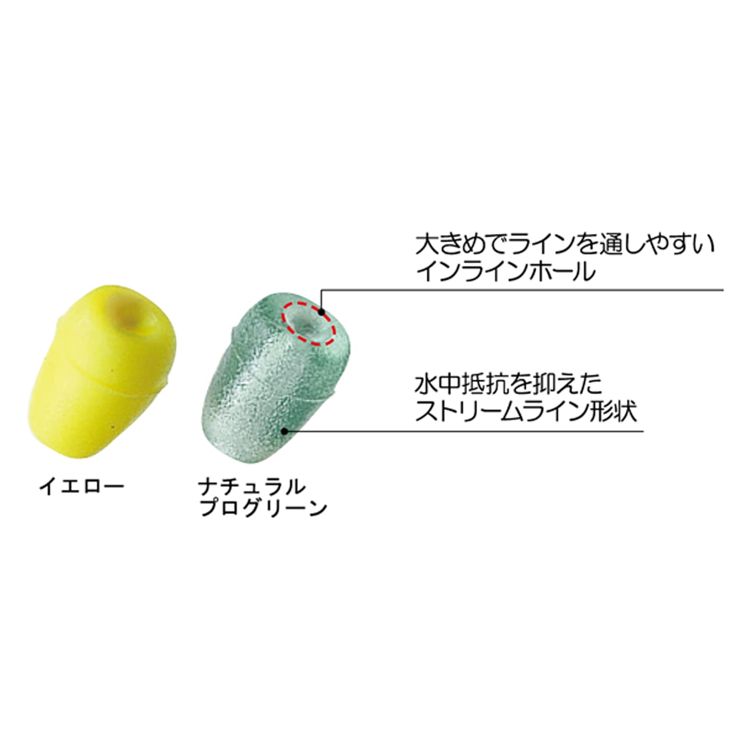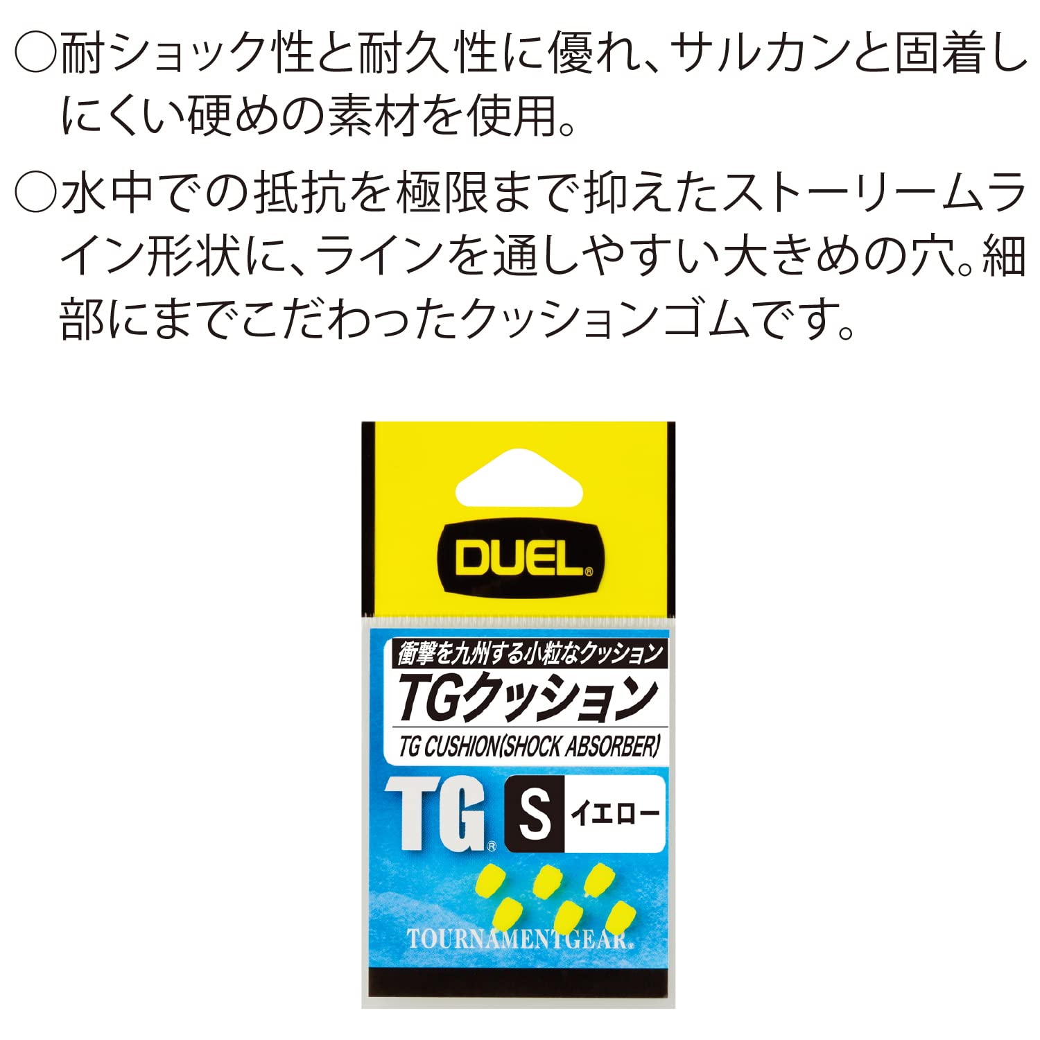 TG クッション■カラー:イエロー/ナチュラルプログリーン■入数:6個●耐ショック性と耐久性に優れ、サルカンと固着しにくい硬めの素材を使用。●水中での抵抗を極限まで抑えたストリームライン形状に、ラインを通しやすい大きめの穴。細部にまでこだわったクッションゴムです。