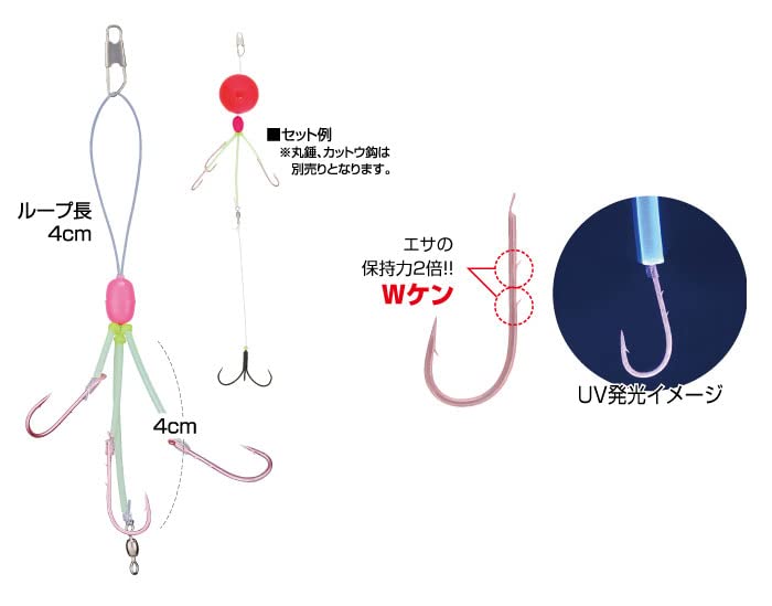 オーナーフグカットウチラシ仕掛◆ハリス号数:6◆ループ糸:10◆品番:36298喰わせ機能+アピール抜群のカットウチラシ仕掛。(1) 喰わせ機能を搭載!掛けるだけが技じゃない!喰わせ機能を付けたことで掛からなかった低活性なフグも仕留めます。(2) 水深や潮流・活性に合わせてオモリを即チェンジ遊動ループにすることで水深や潮流に合わせた重量やカラーに即チェンジ!!また、フロロカーボンなので耐久性も抜群!※丸錘基準となります。(3) カモフラージュ効果&Wケン鈎はカモフラ効果の高い甘エビケイムラ。エサ盗りに強いWケン採用。