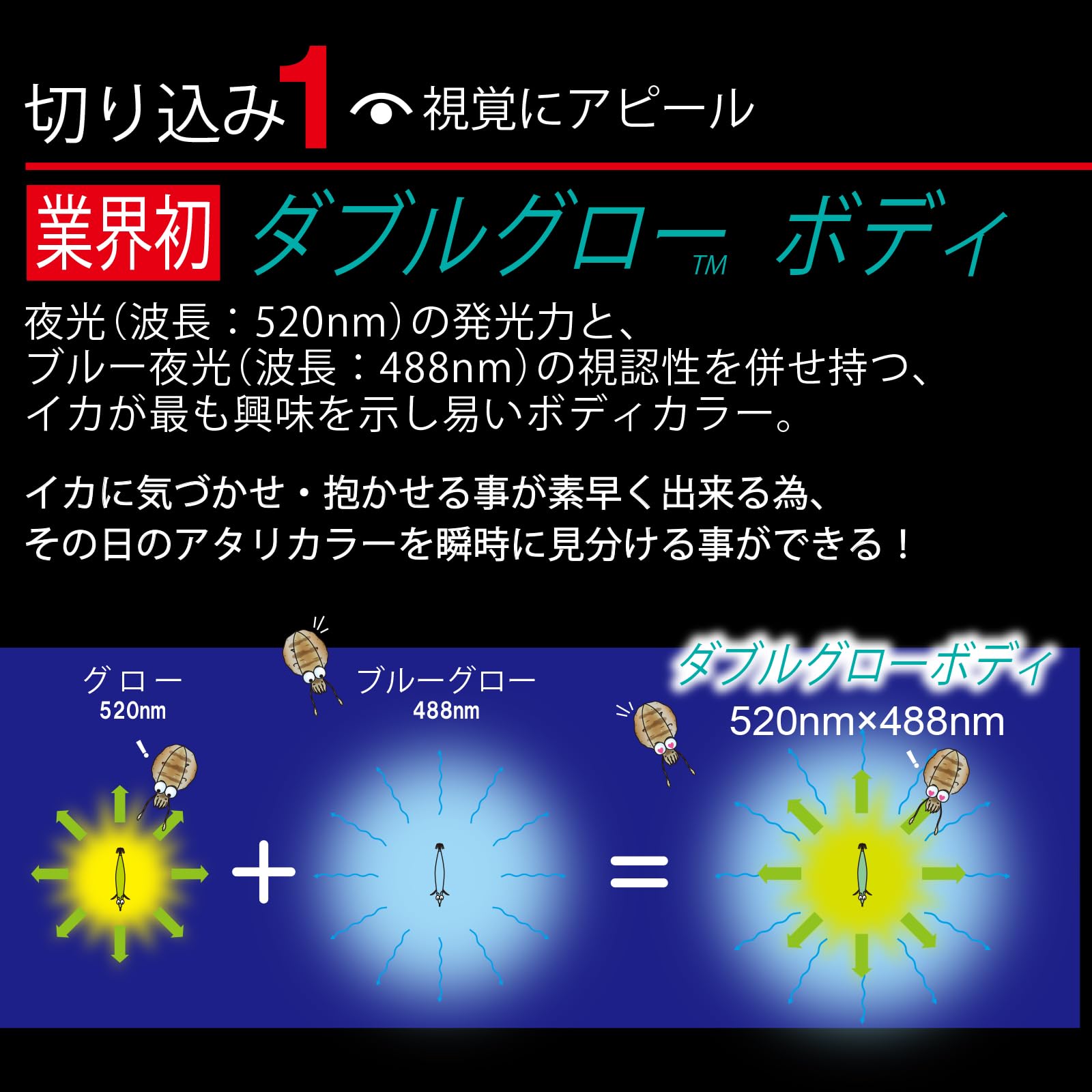 ダブルグローボディ:イカが最も興味を示し易い夜光(波長:520nm)の発光力とブルー夜光(波長:488nm)の視認性で、イカに気づかせ・抱かせる事が素早く出来る為、その日のアタリカラーを瞬時に見分ける事ができる!