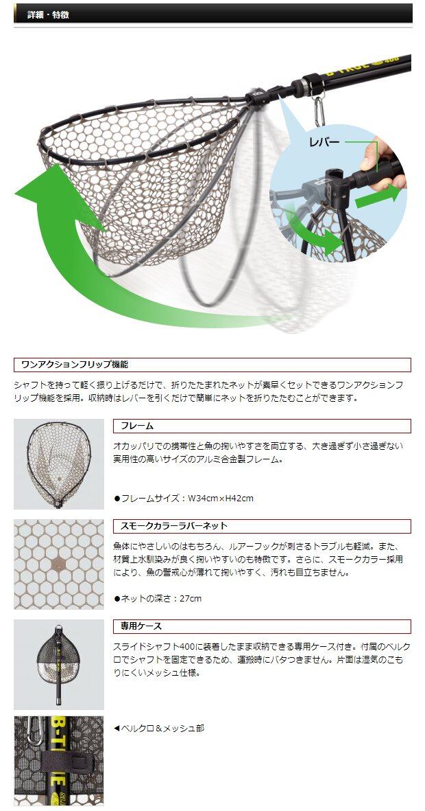 ラバーランディングネット + スライドシャフト400(別売)が、そんな制約の多い条件下で釣りを楽しむオカッパリアングラーをしっかりサポートします。